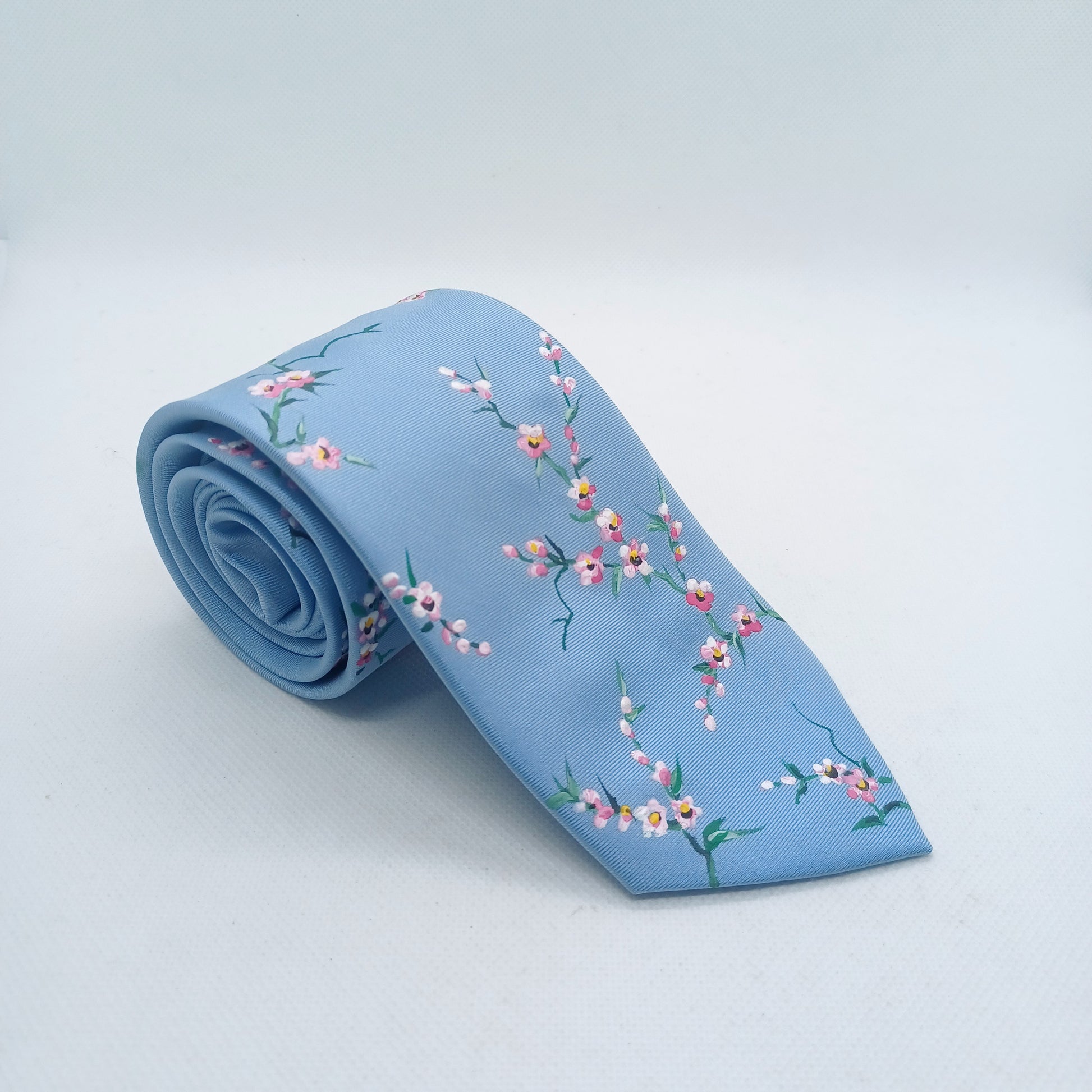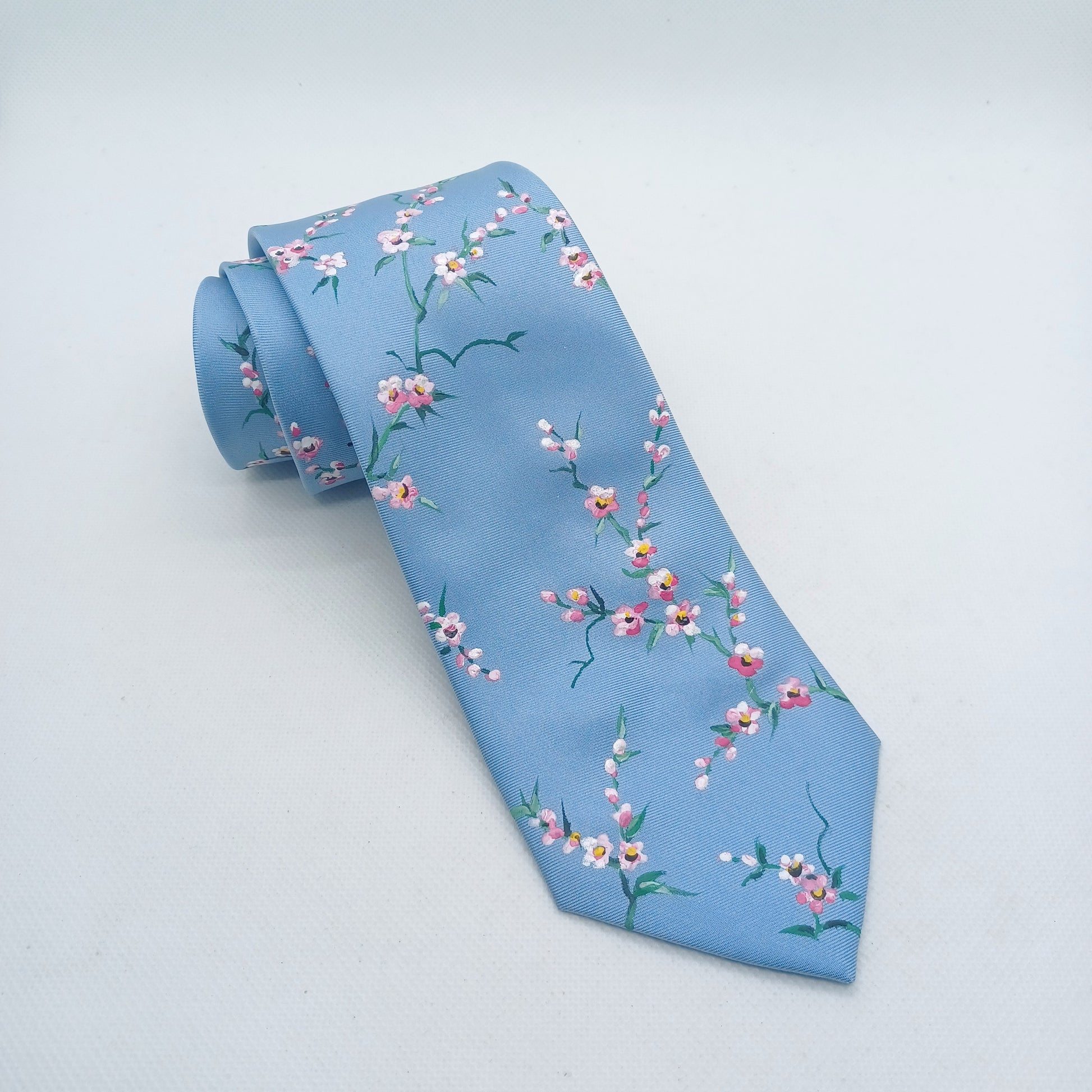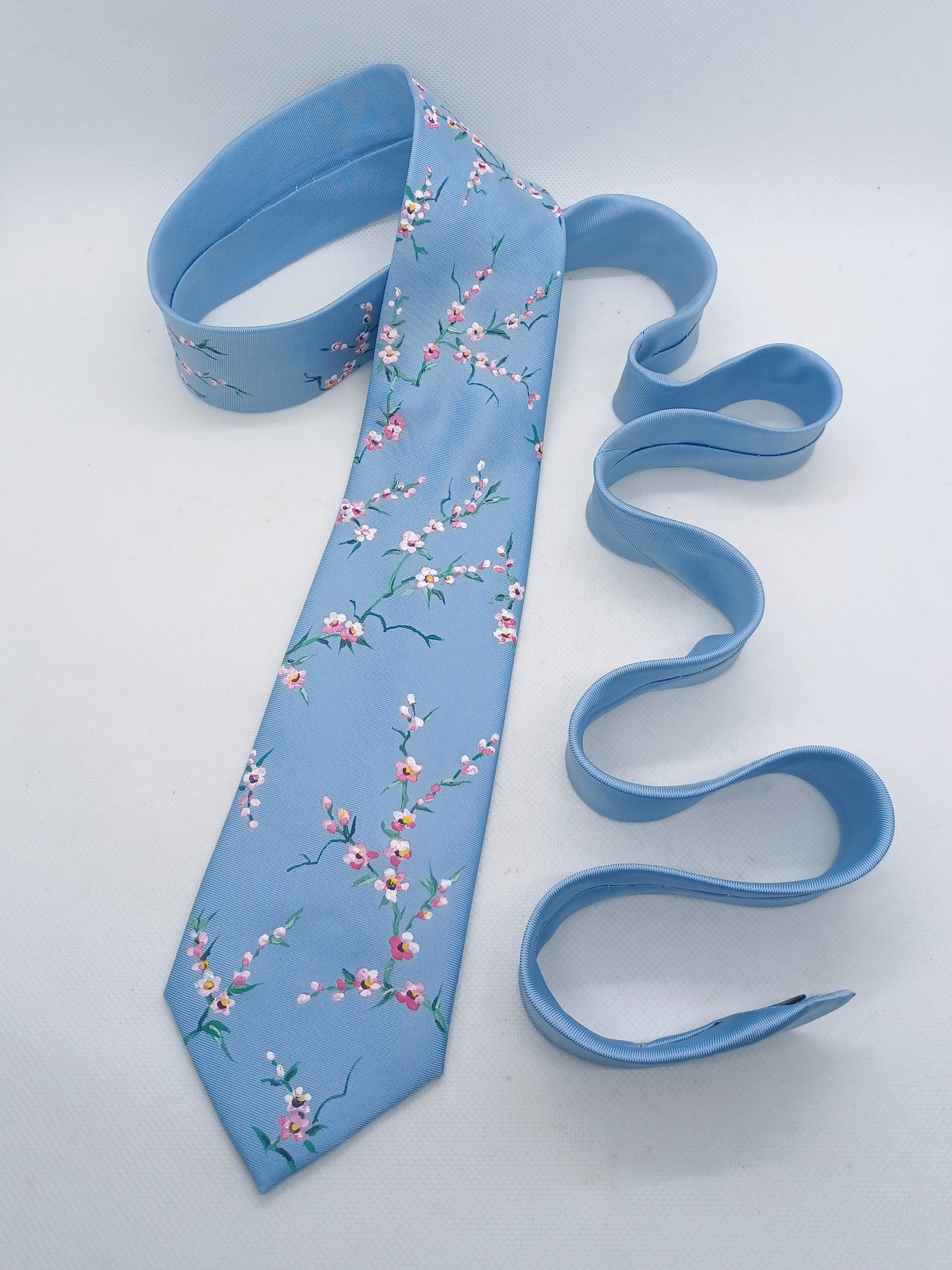 On a base of light blue silk this design has been intricately hand painted with pink and white cherry blossoms. A versatile design that is delicate and stylish.