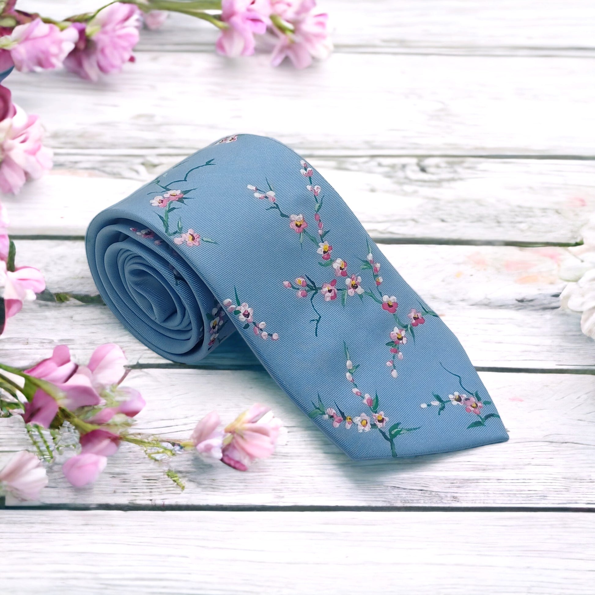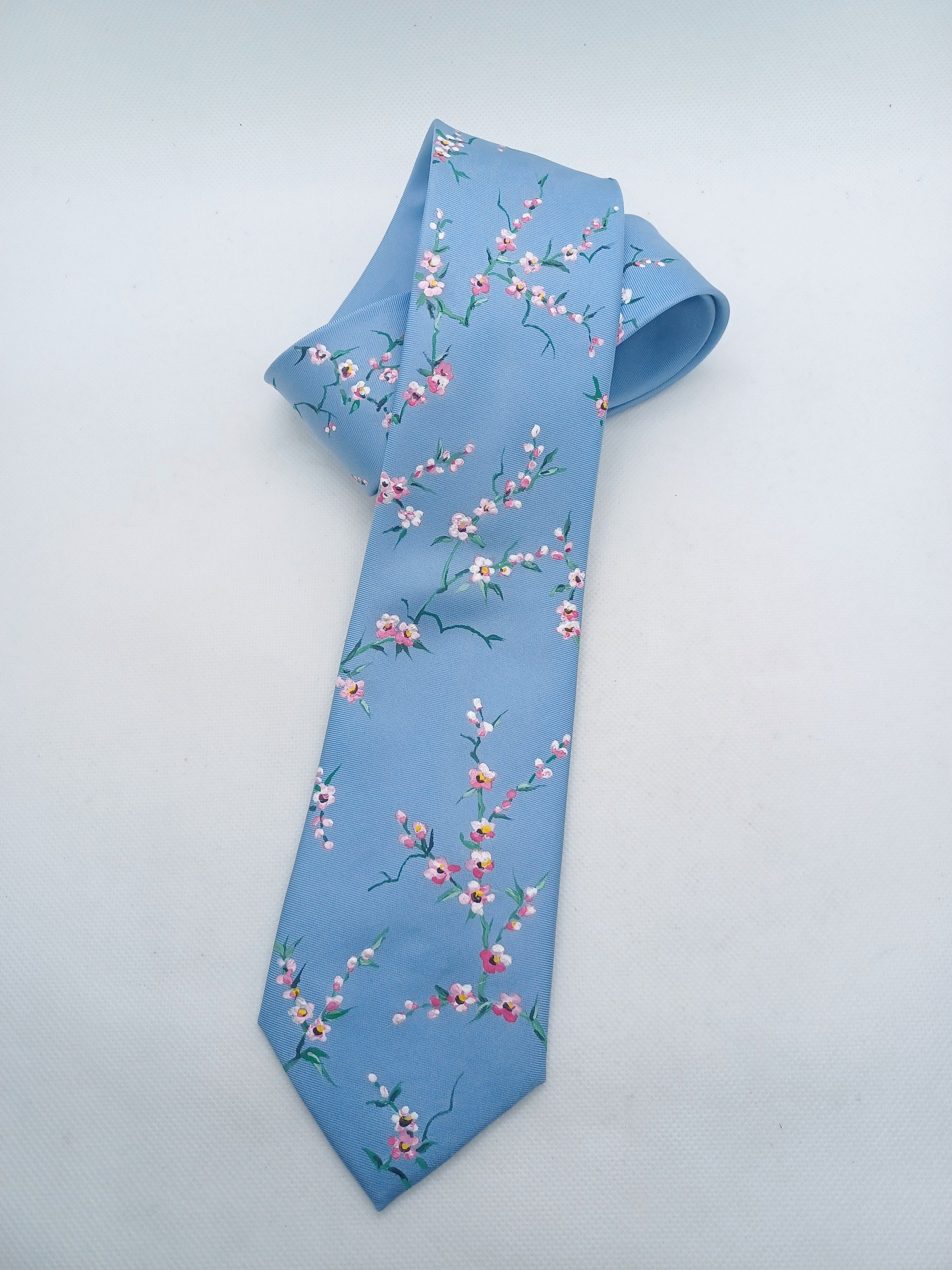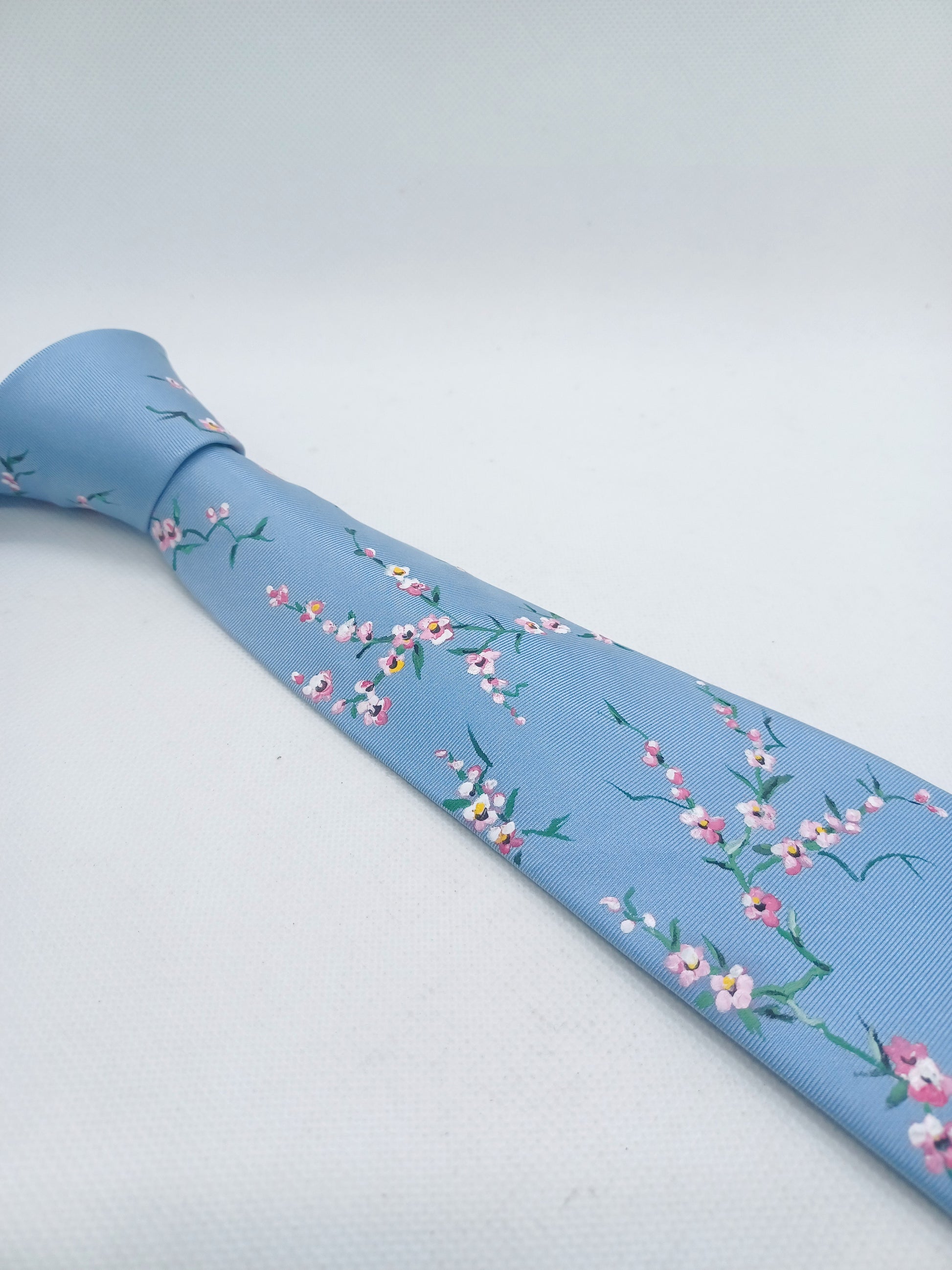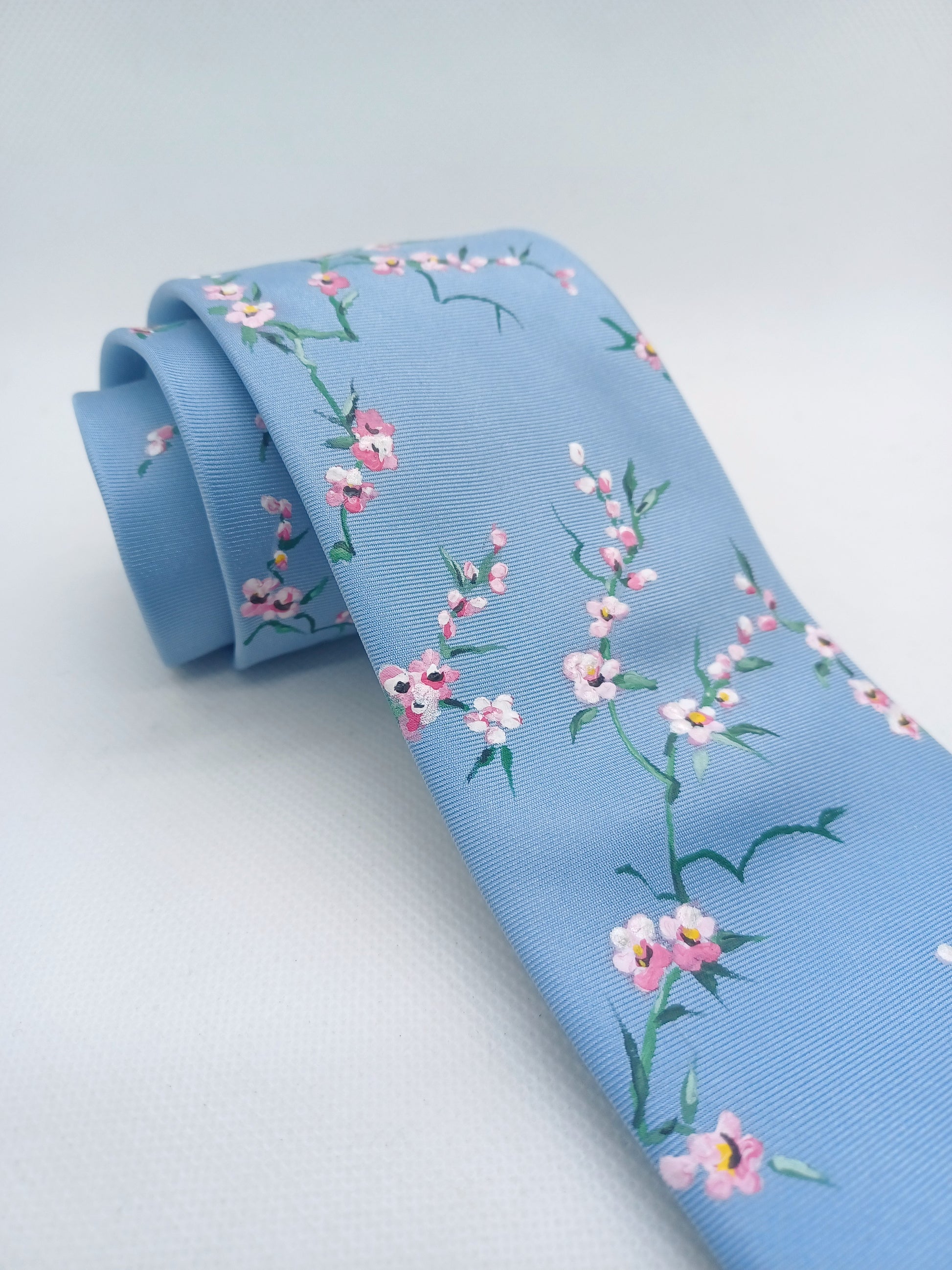 On a base of light blue silk this design has been intricately hand painted with pink and white cherry blossoms. A versatile design that is delicate and stylish.