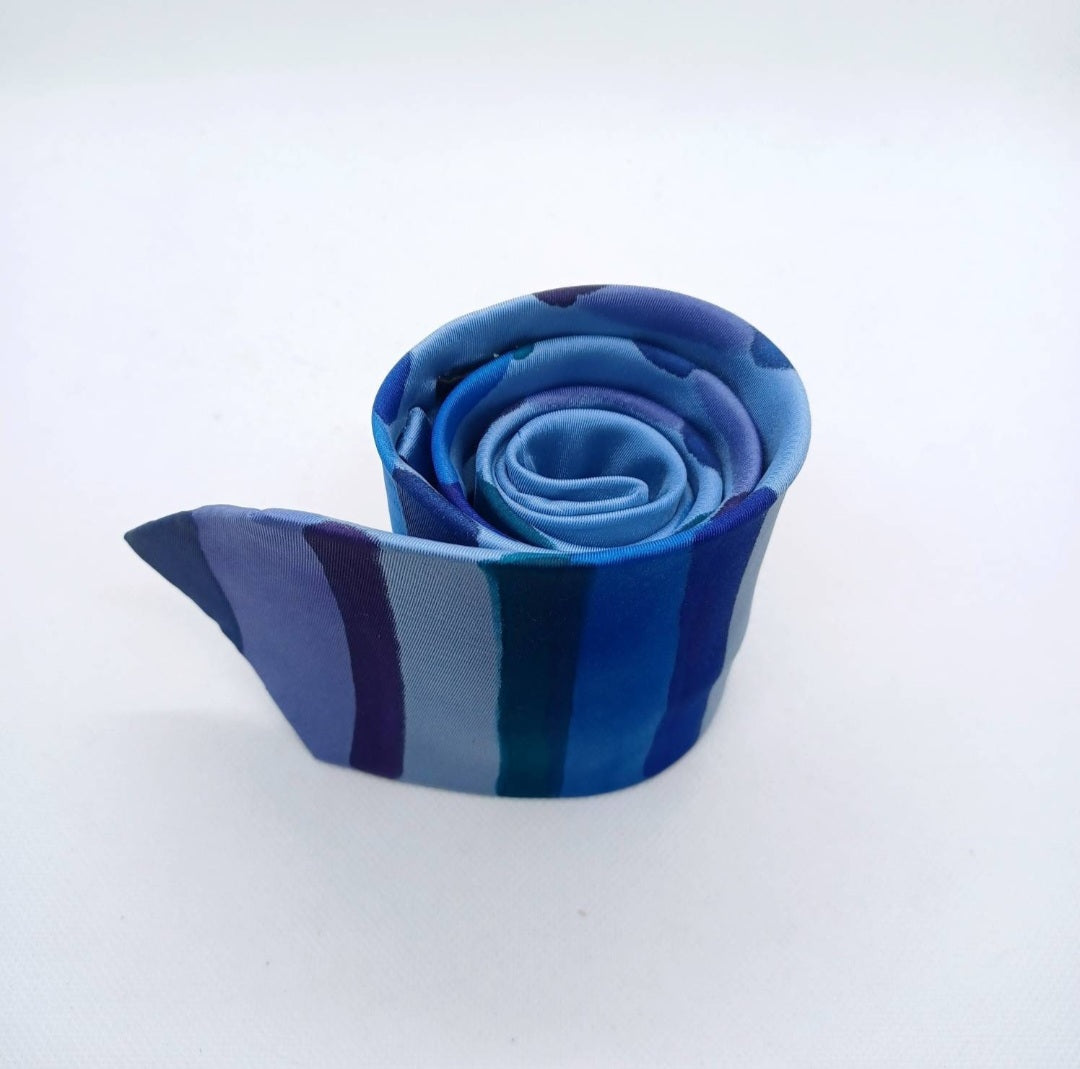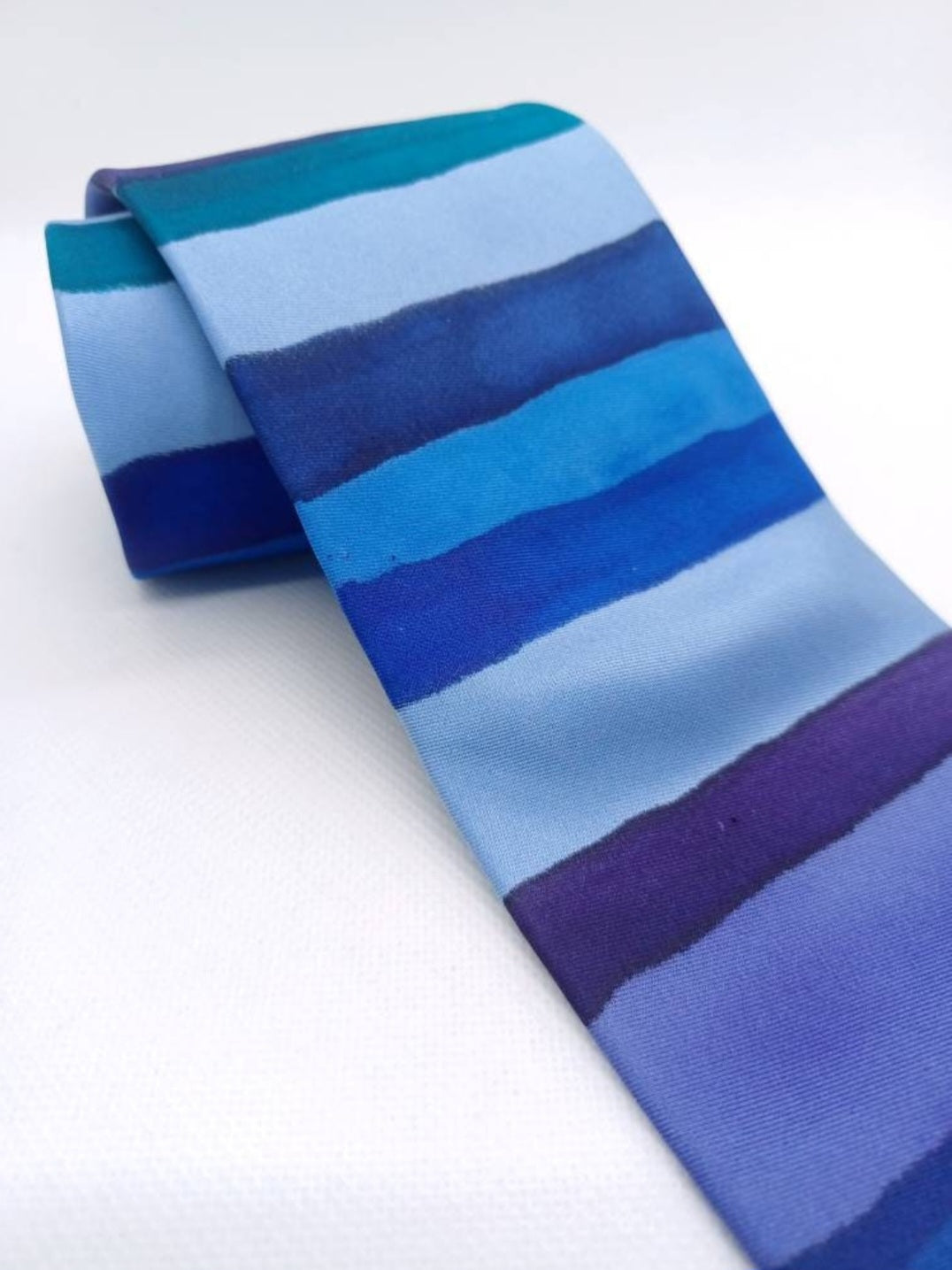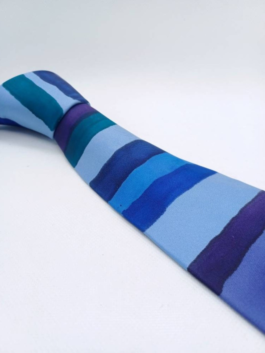 On a base of light blue silk this tie is hand painted in a classic horizontal stripe in shades of navy, indigo and teal.