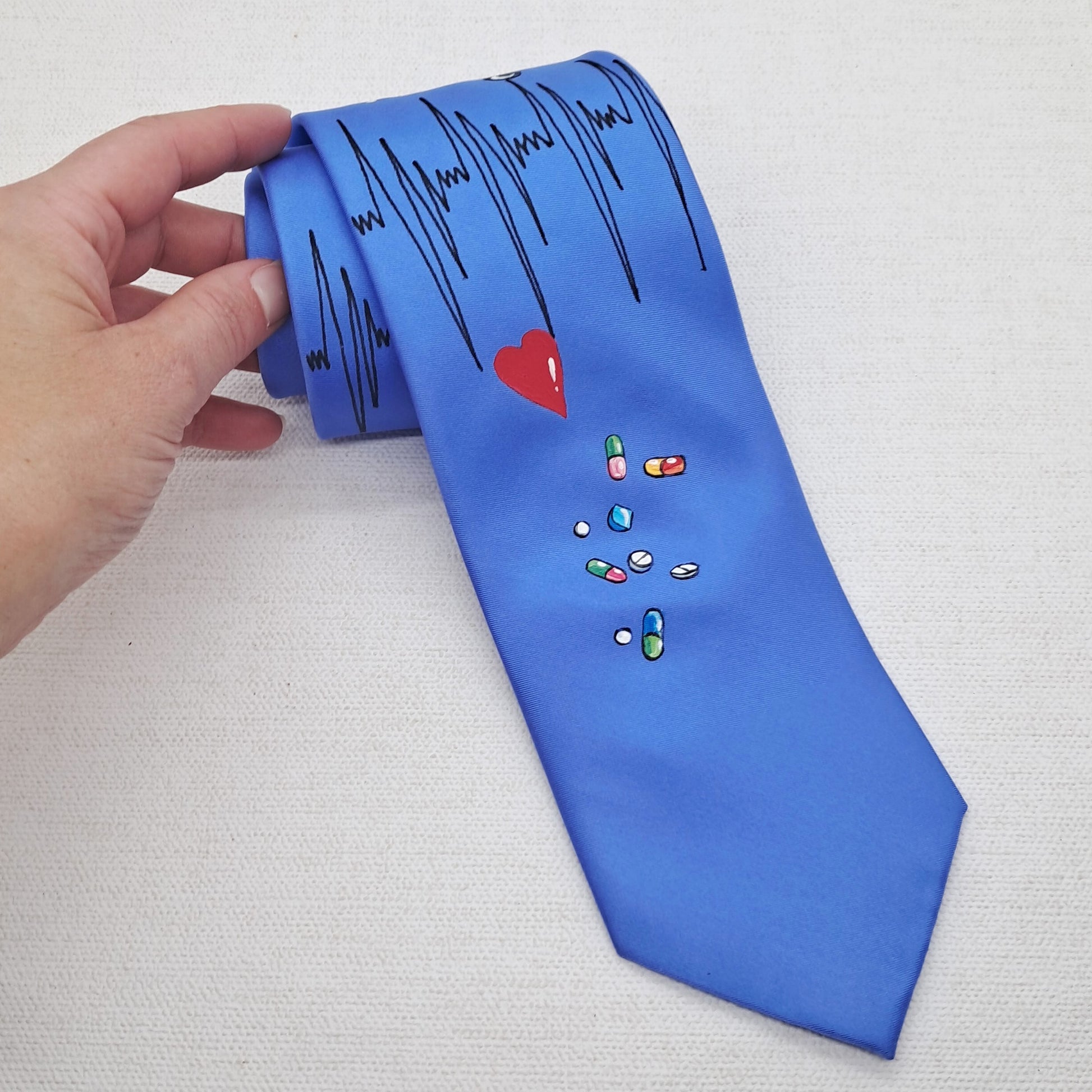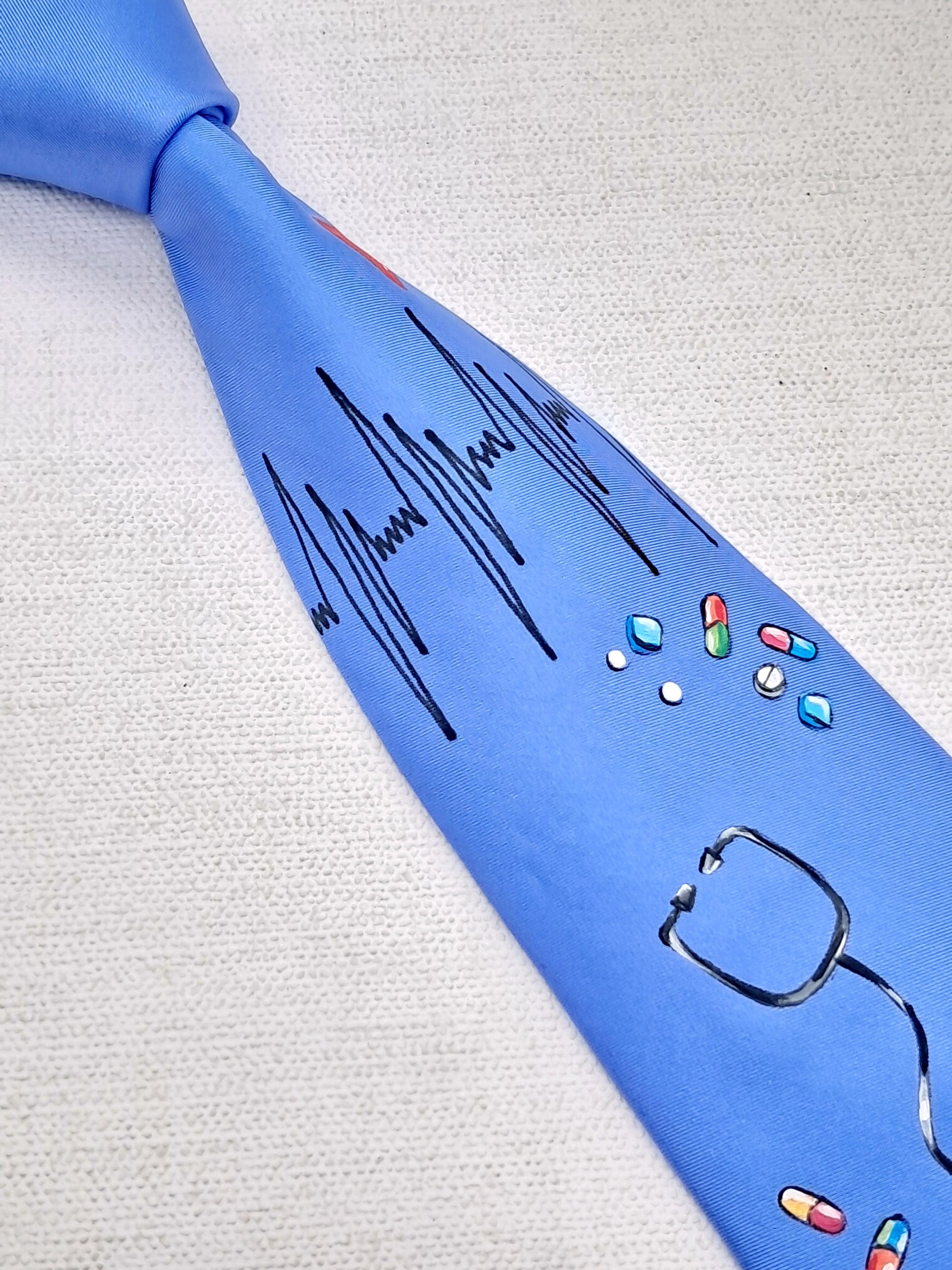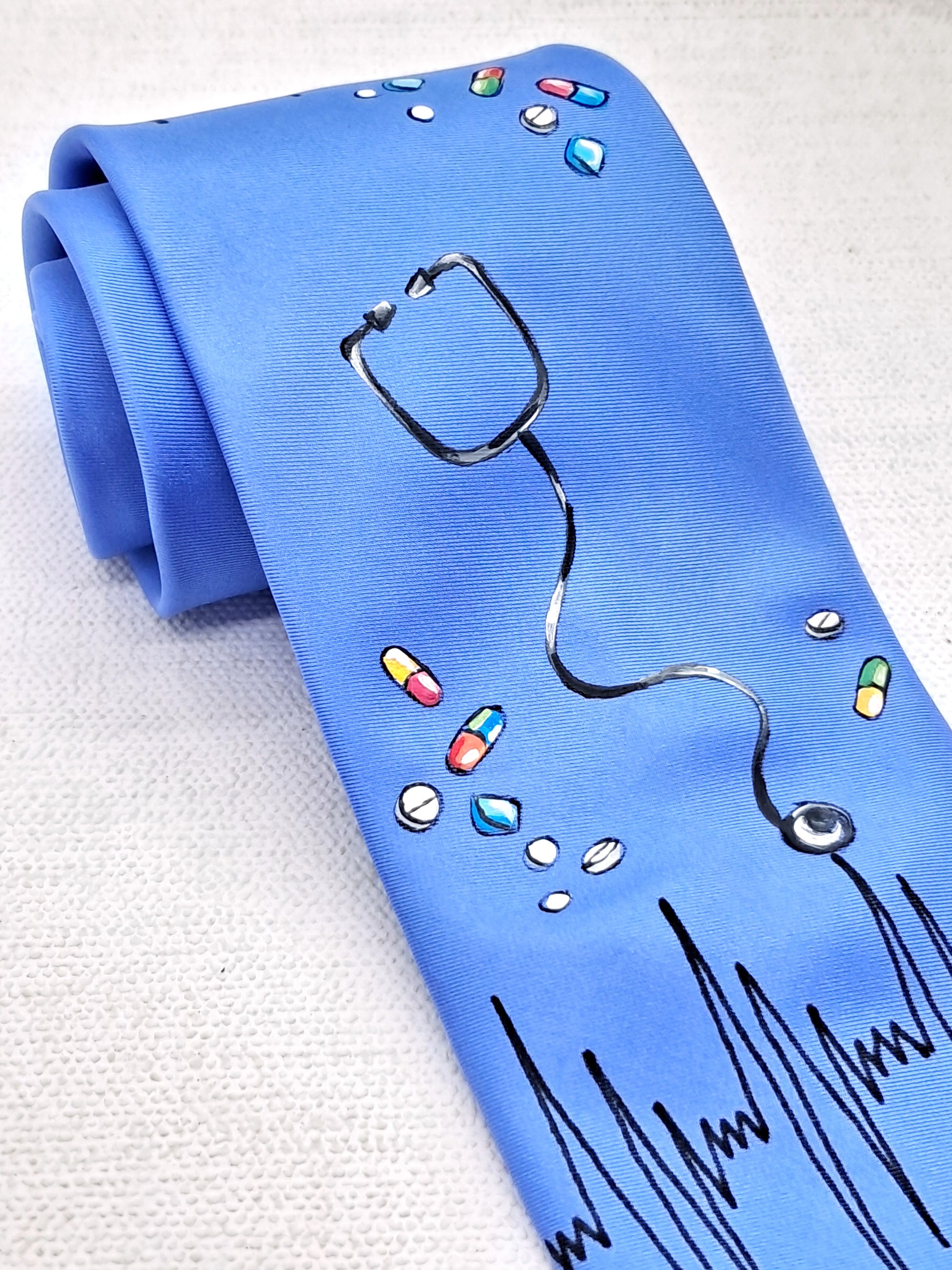 On a base of royal blue silk this medical based design is hand painted with a stethoscope, multicoloured pills and capsules, hearts and heart rates.