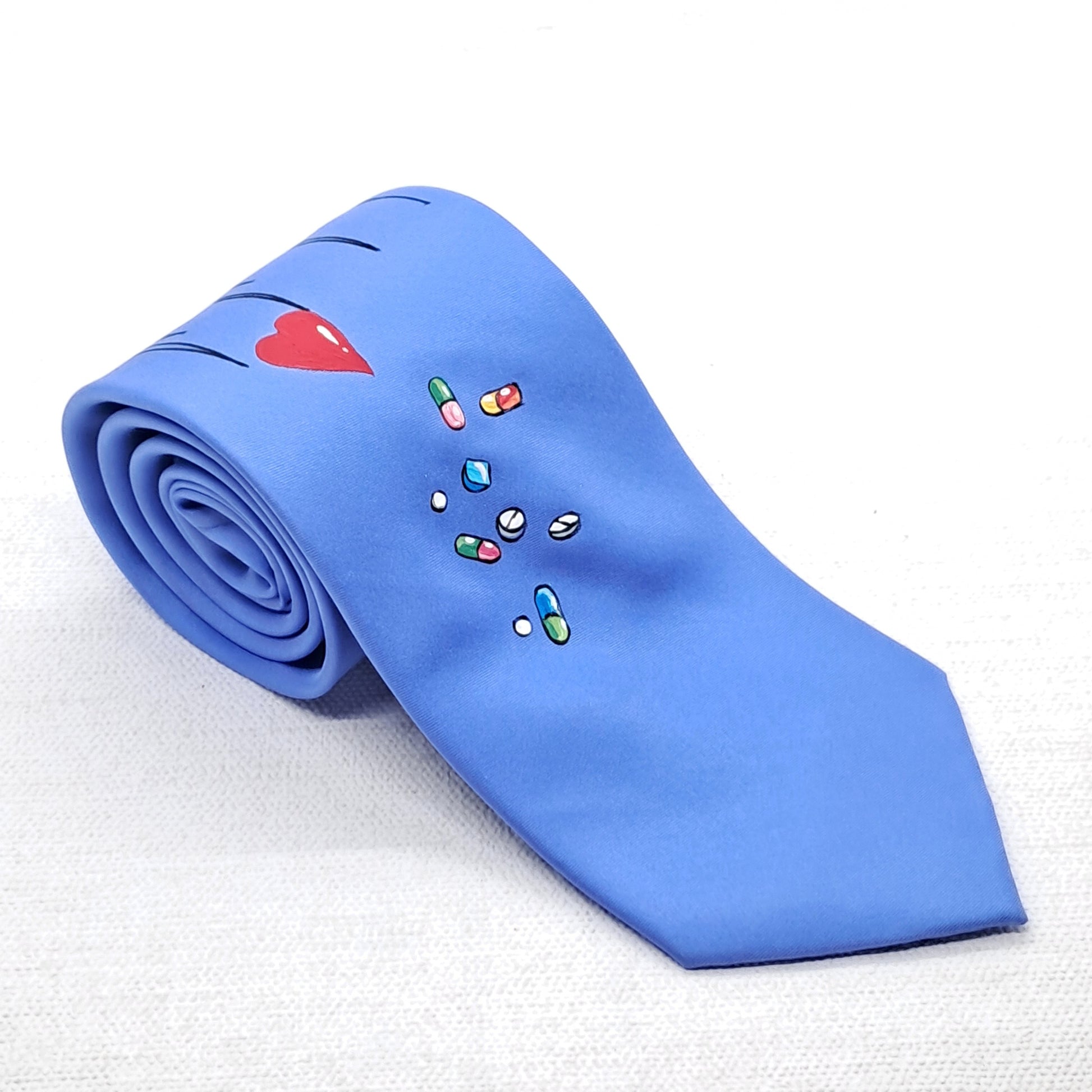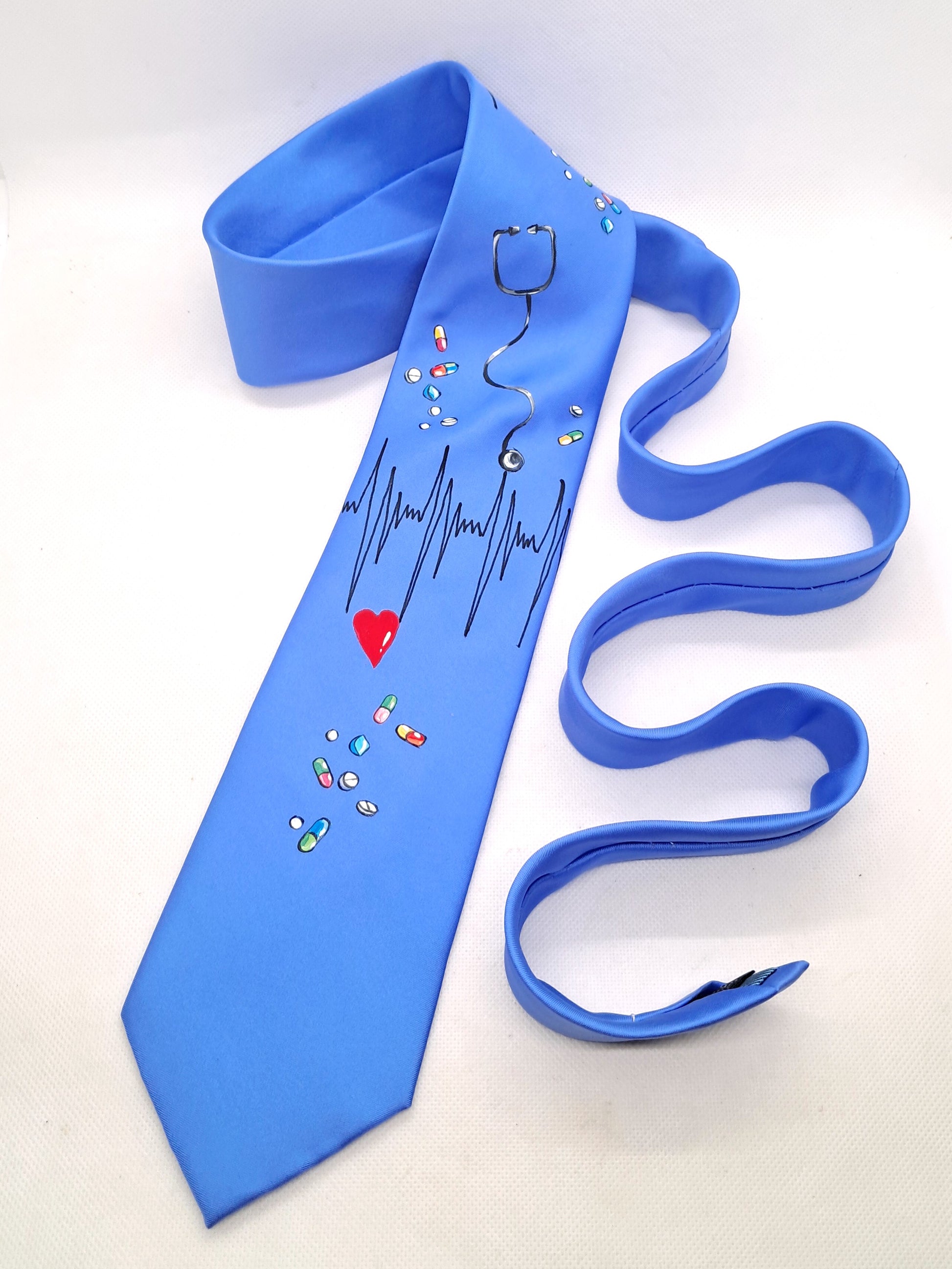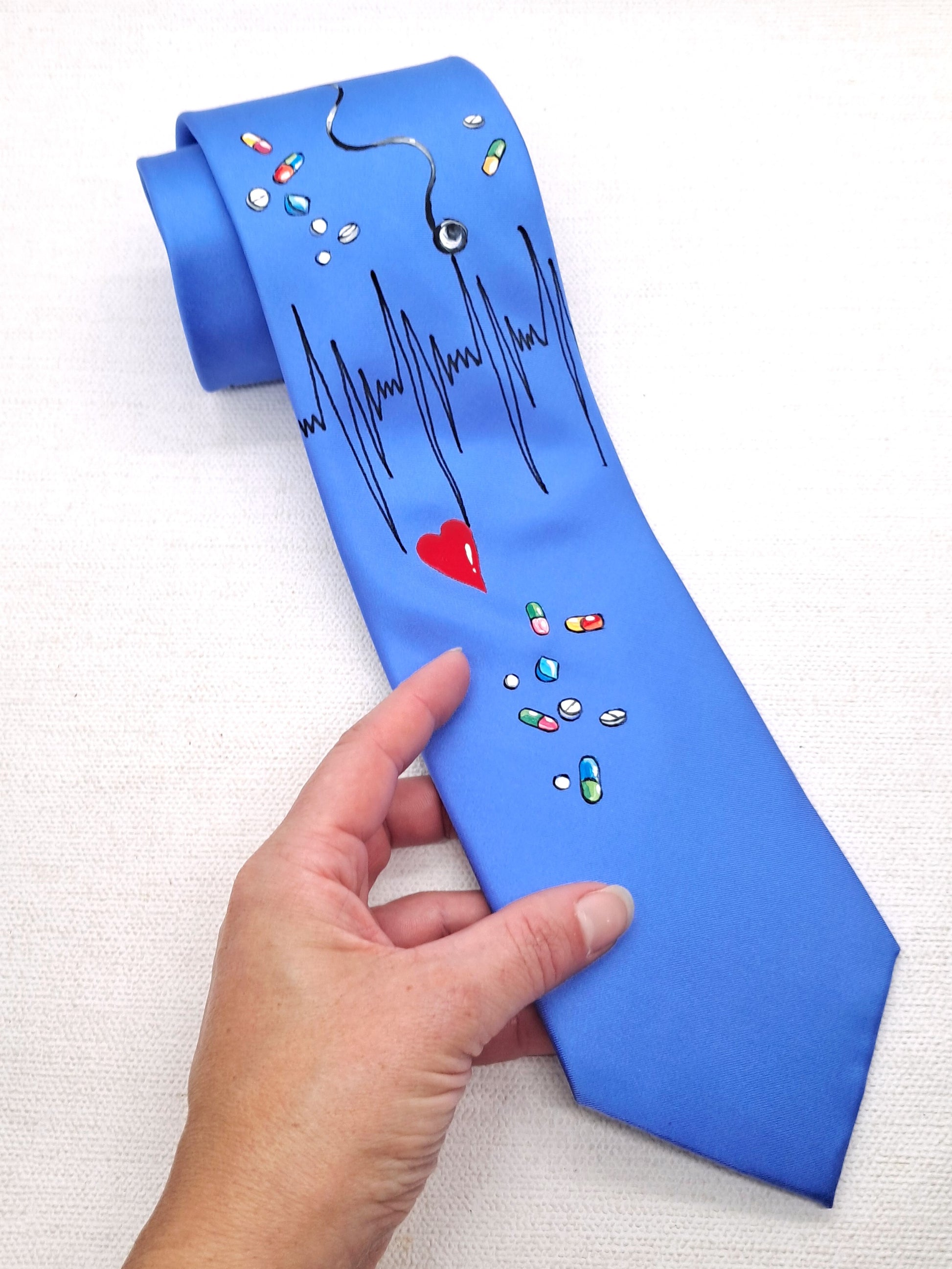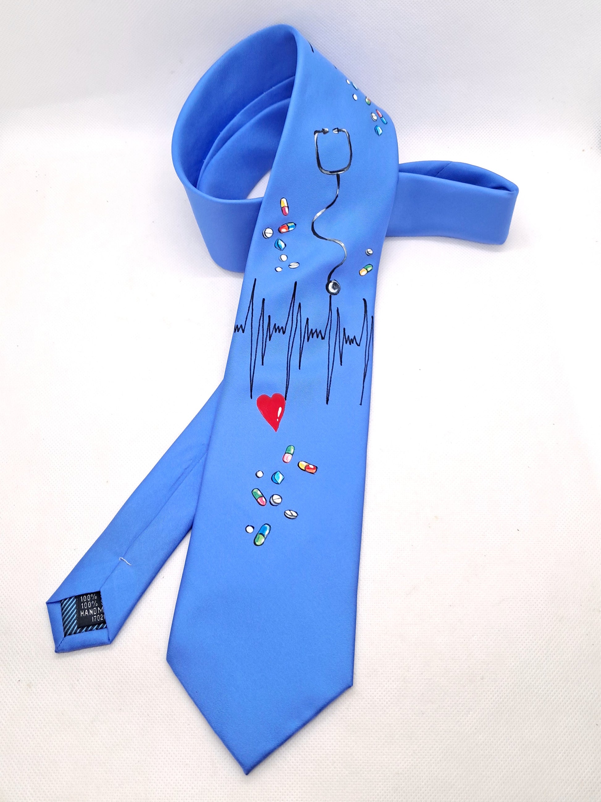 On a base of royal blue silk this medical based design is hand painted with a stethoscope, multicoloured pills and capsules, hearts and heart rates.