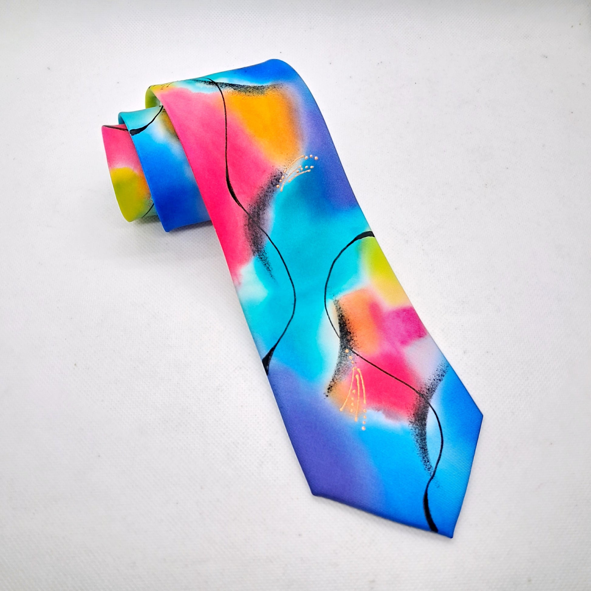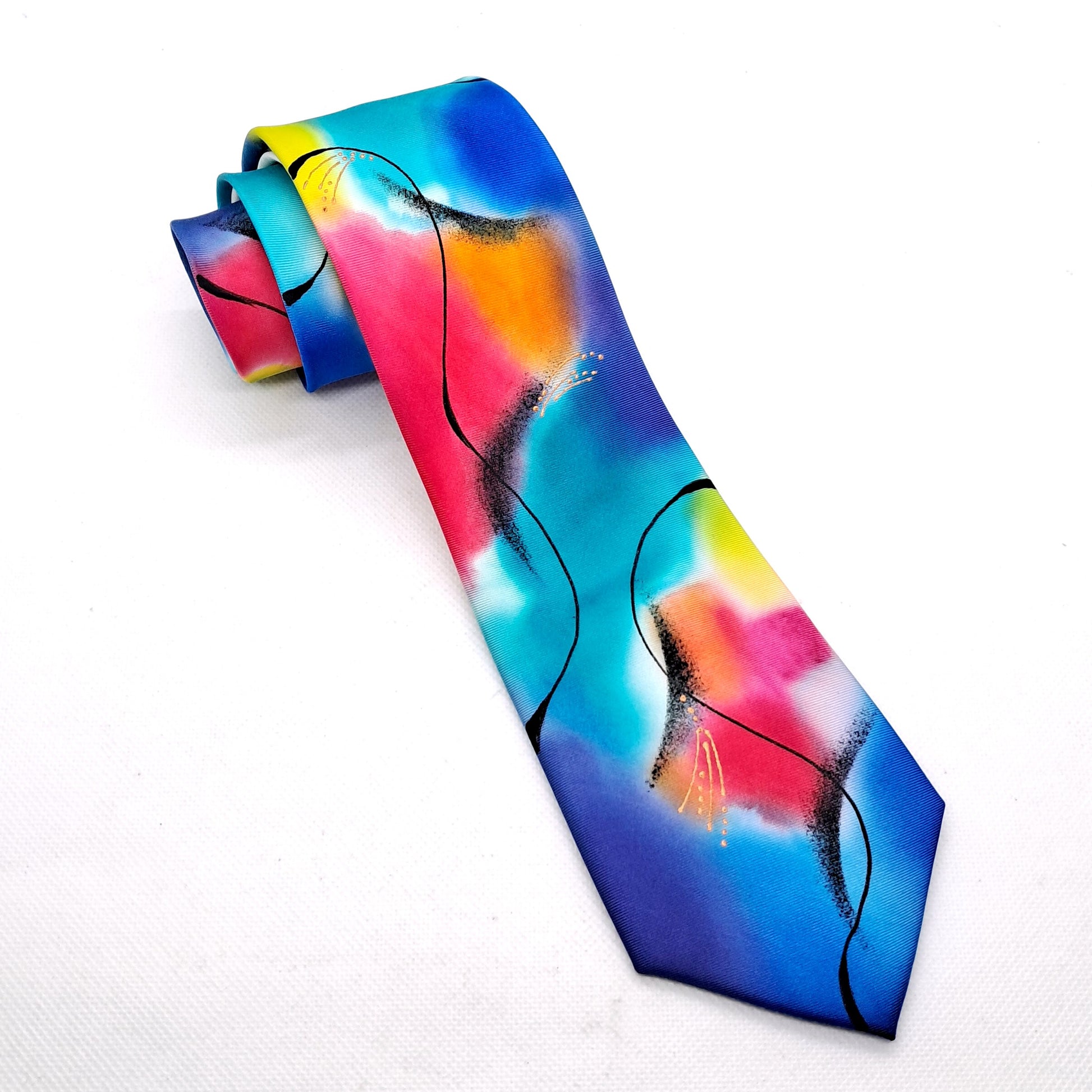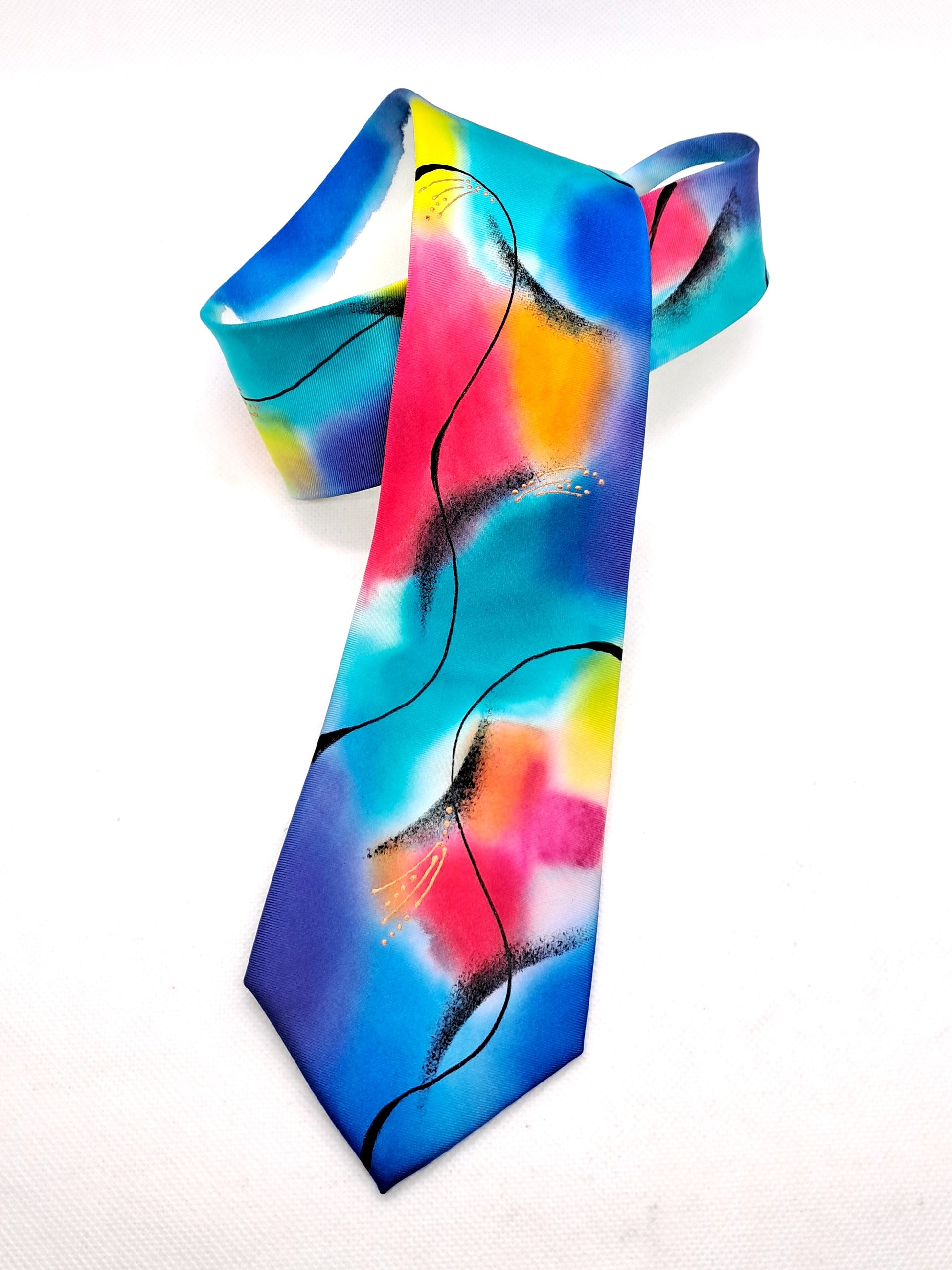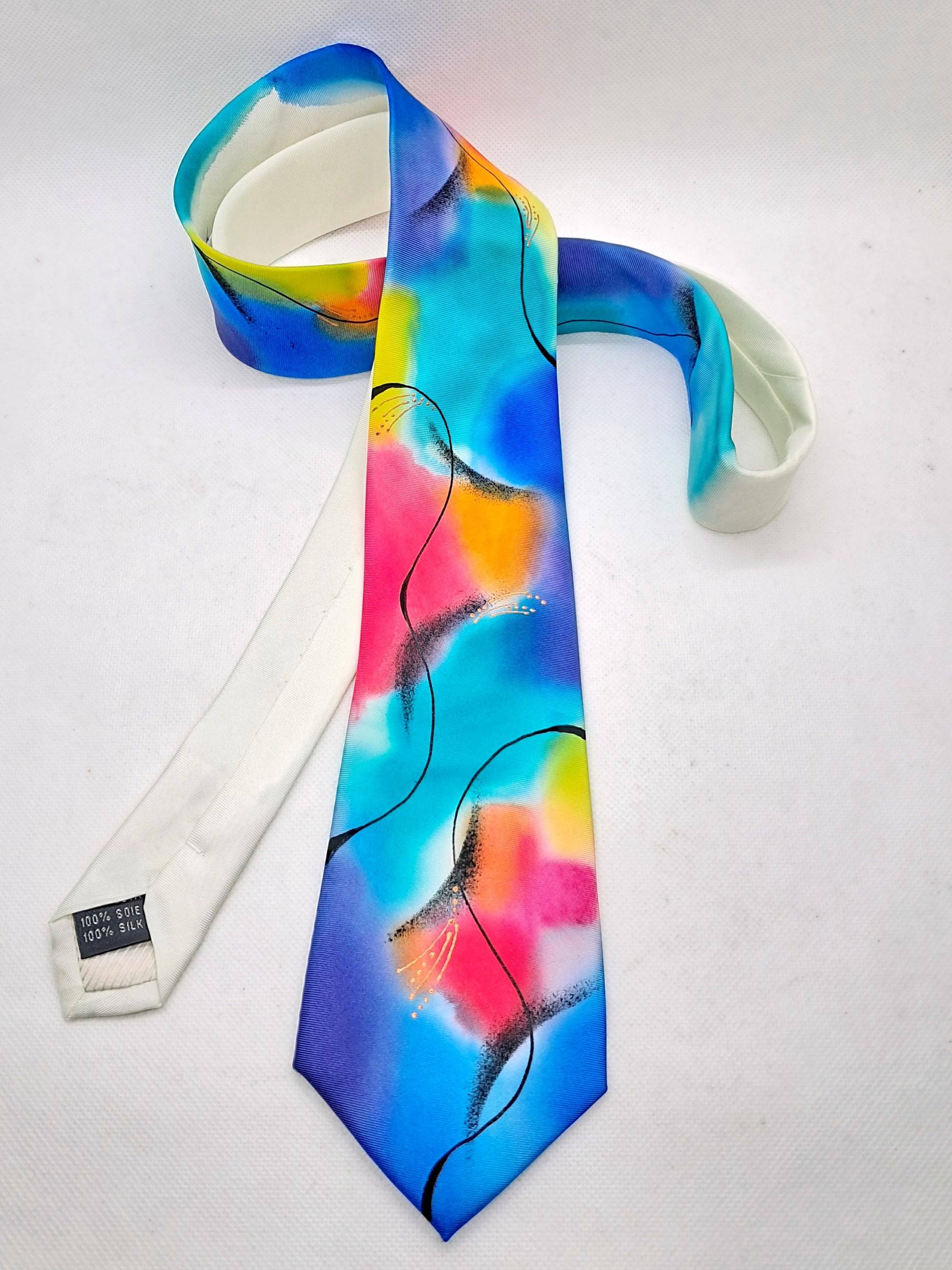 On a base of creamy white pure silk this design is hand painted in multicoloured tonal silk dyes in my signature, abstract style. Shades of turquoise, indigo, pink and lime are contrasted with black swirled lines. A versatile tie that is pleasing to the eye.