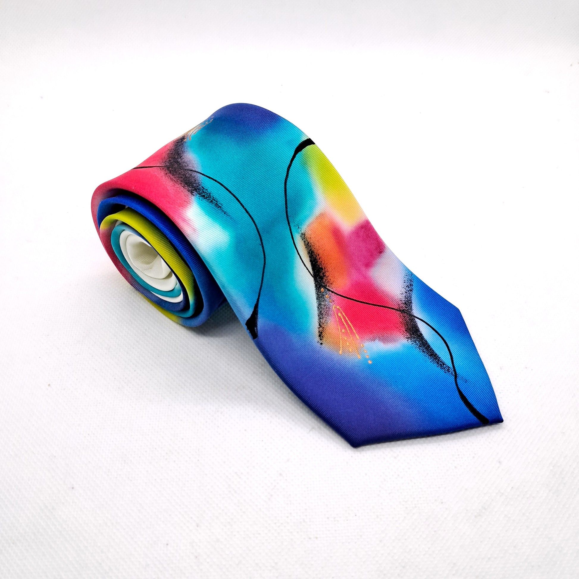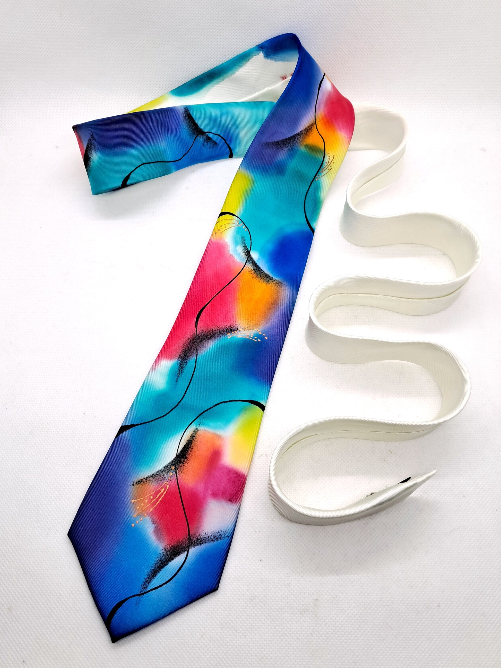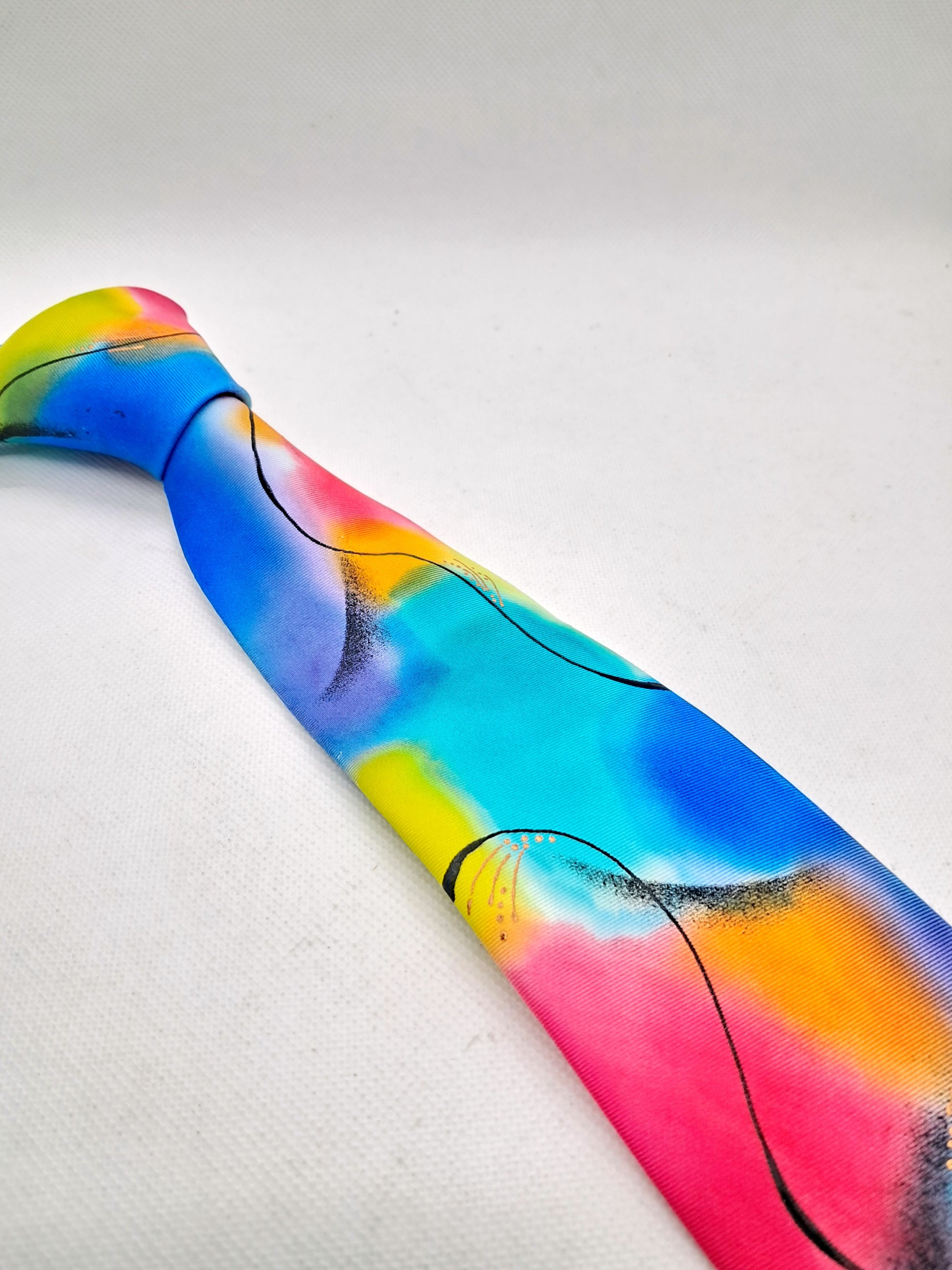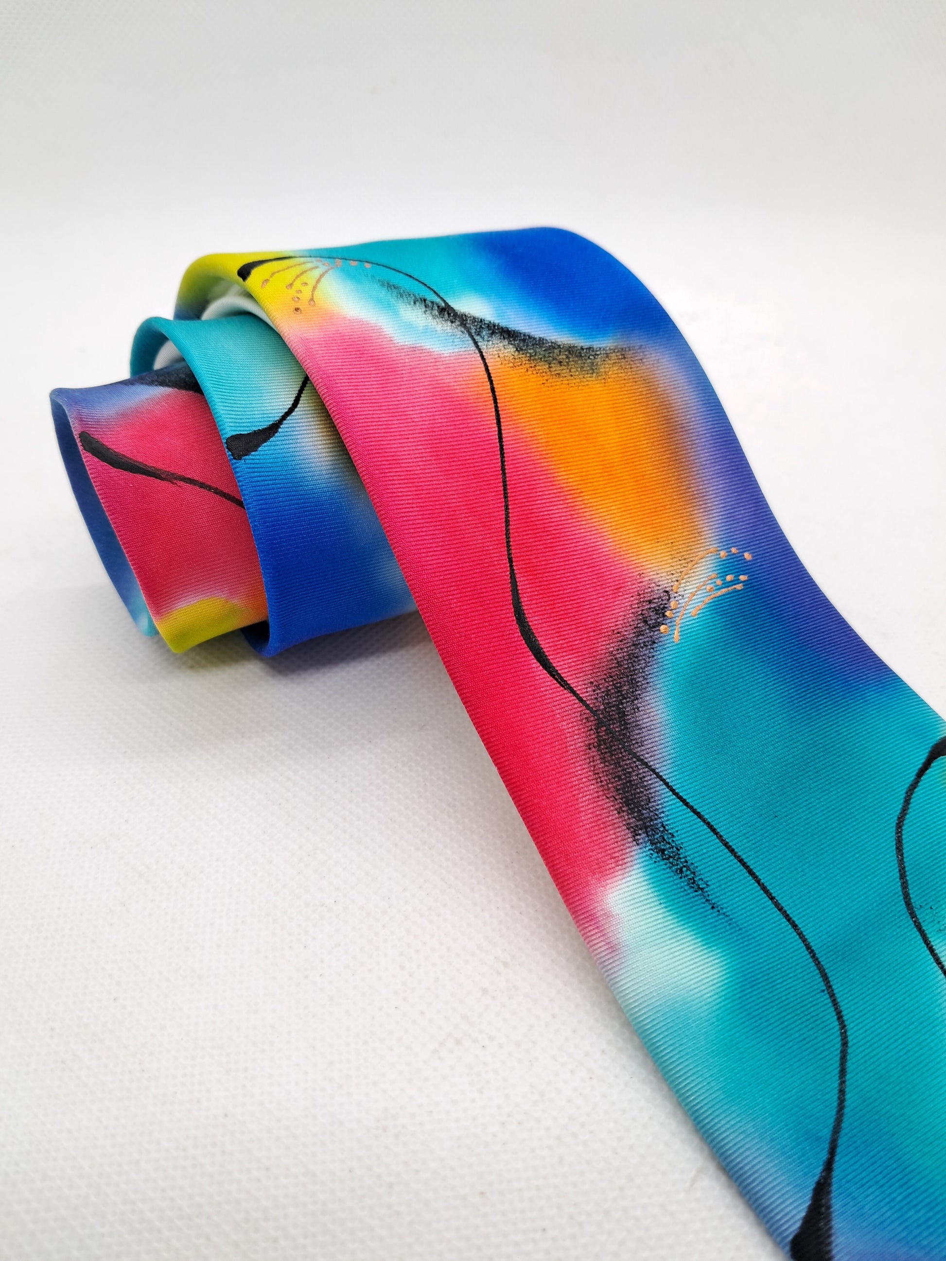On a base of creamy white pure silk this design is hand painted in multicoloured tonal silk dyes in my signature, abstract style. Shades of turquoise, indigo, pink and lime are contrasted with black swirled lines. A versatile tie that is pleasing to the eye.