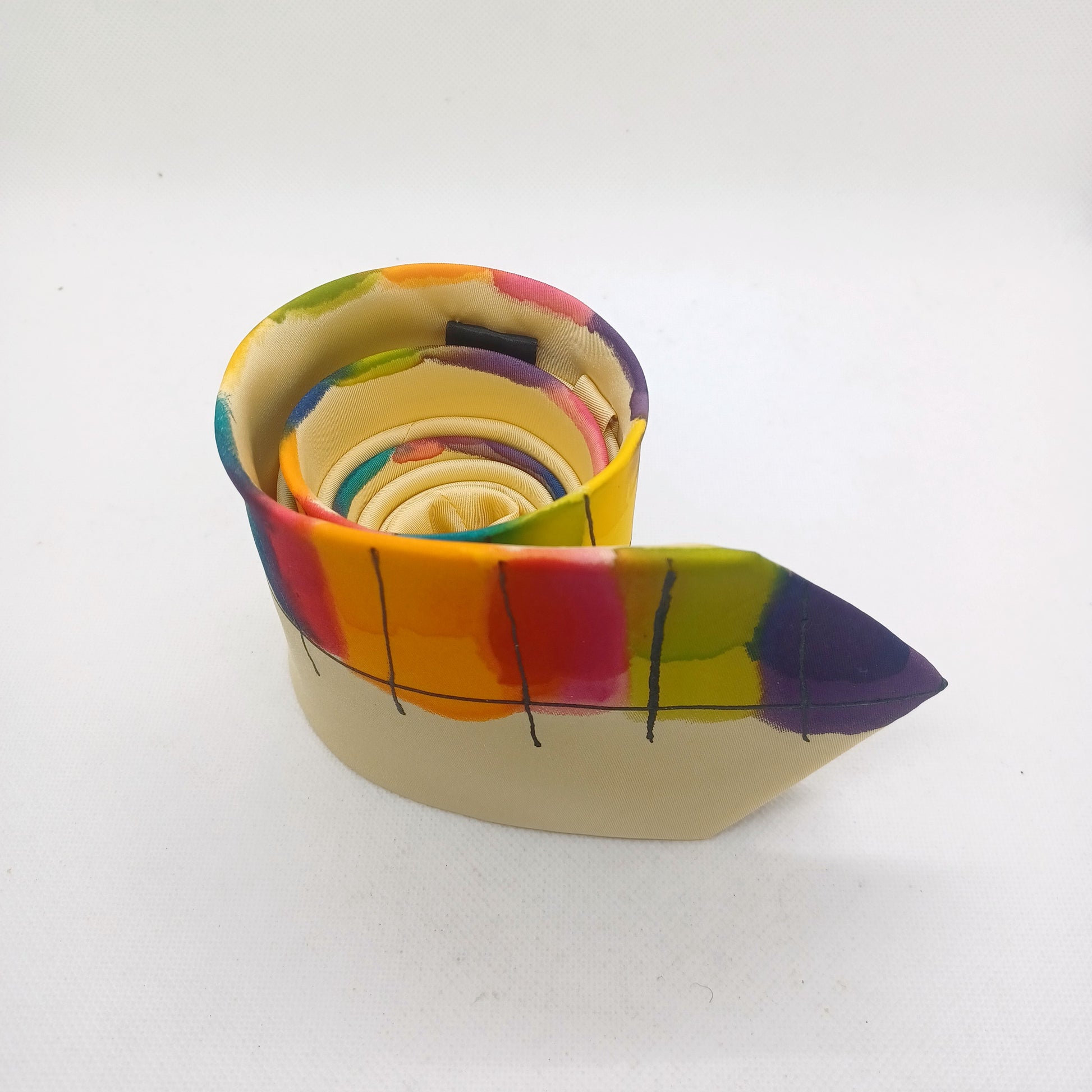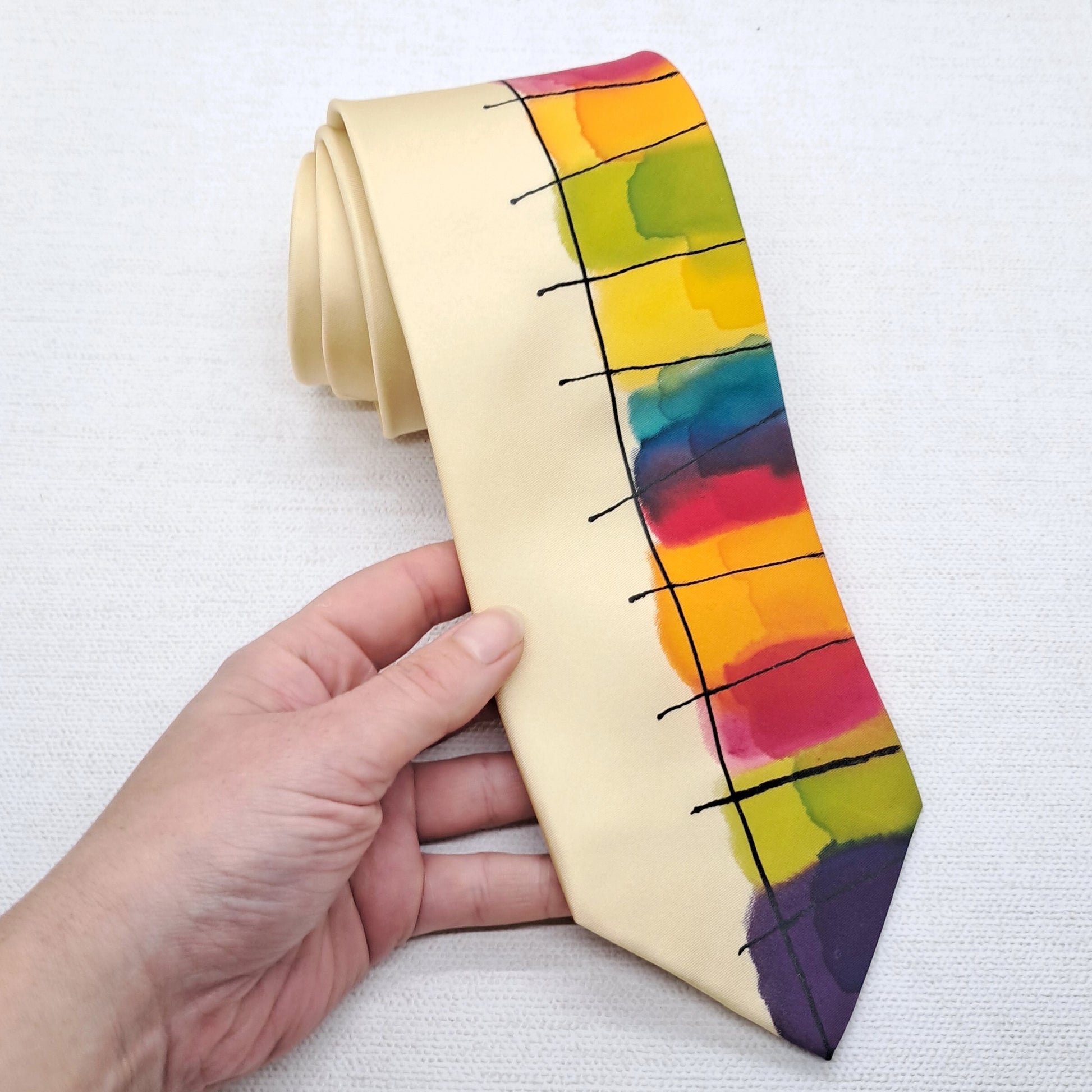 On a base of sandy yellow pure silk this tie is hand painted with multicoloured stripes on the right hand side of the tie. The design is finished with black fine detailing for contrast. A bright and vibrant design that looks particularly striking when knotted.