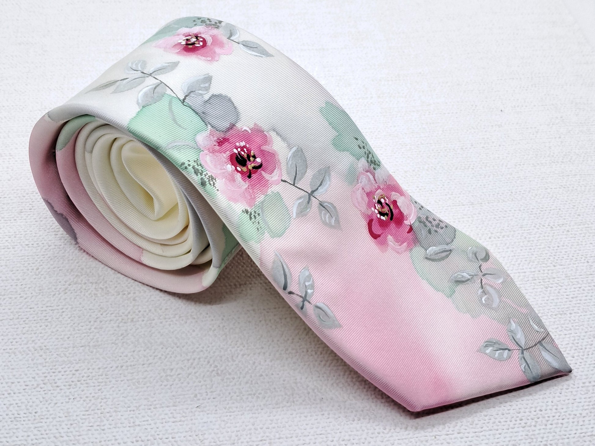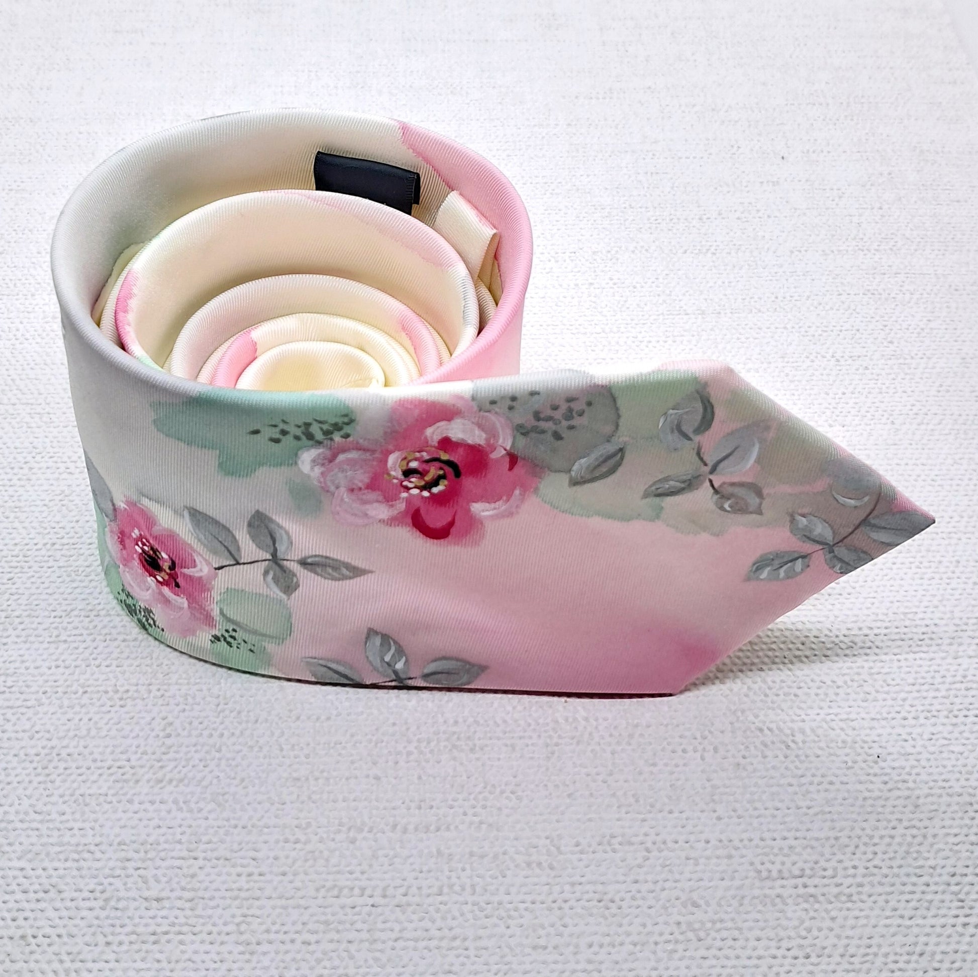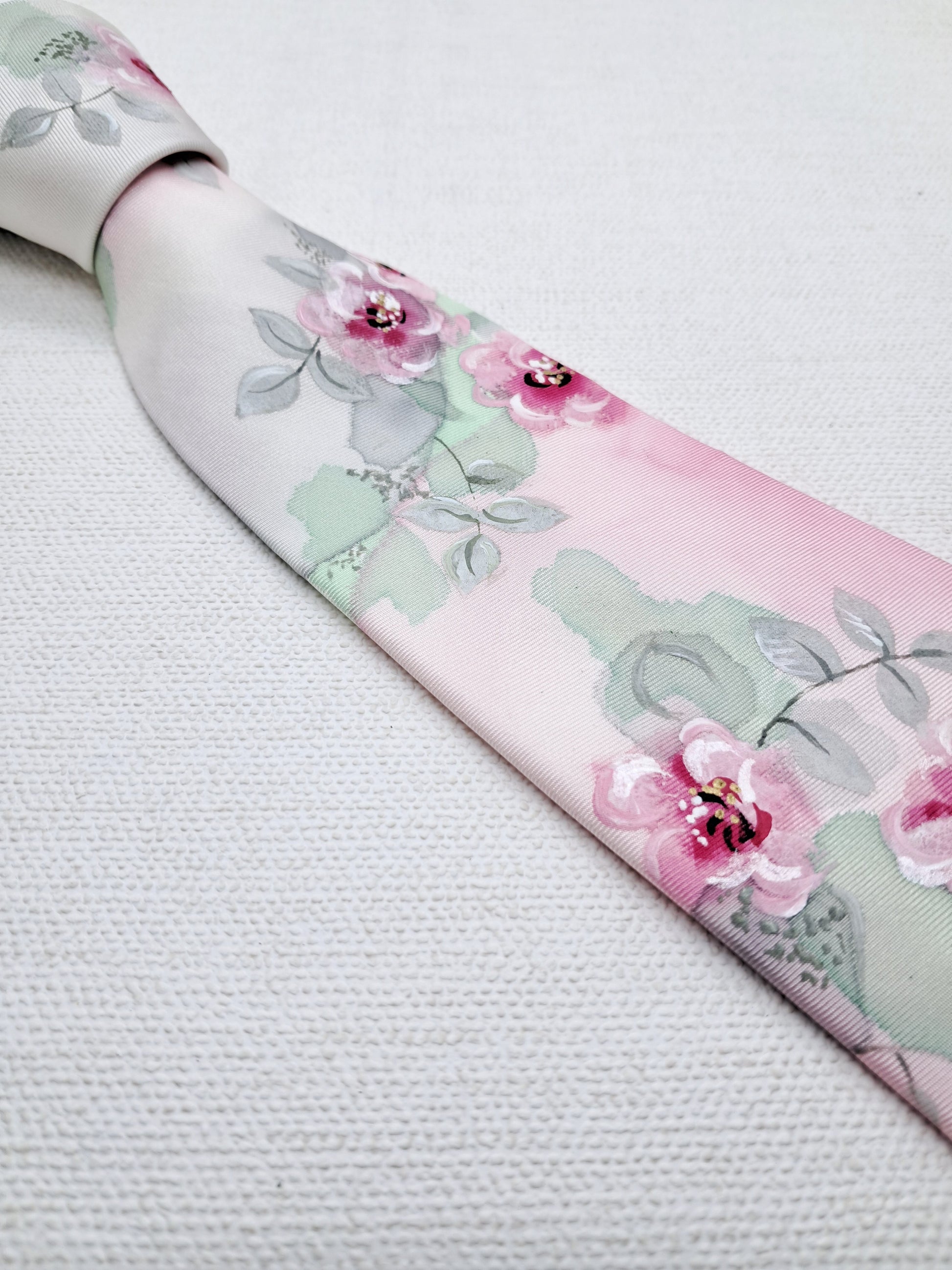 On a base of creamy white pure silk this tie is hand painted with pale pink flowers with pastel green and grey silk dyes. A floral design perfect for weddings, spring and summer.