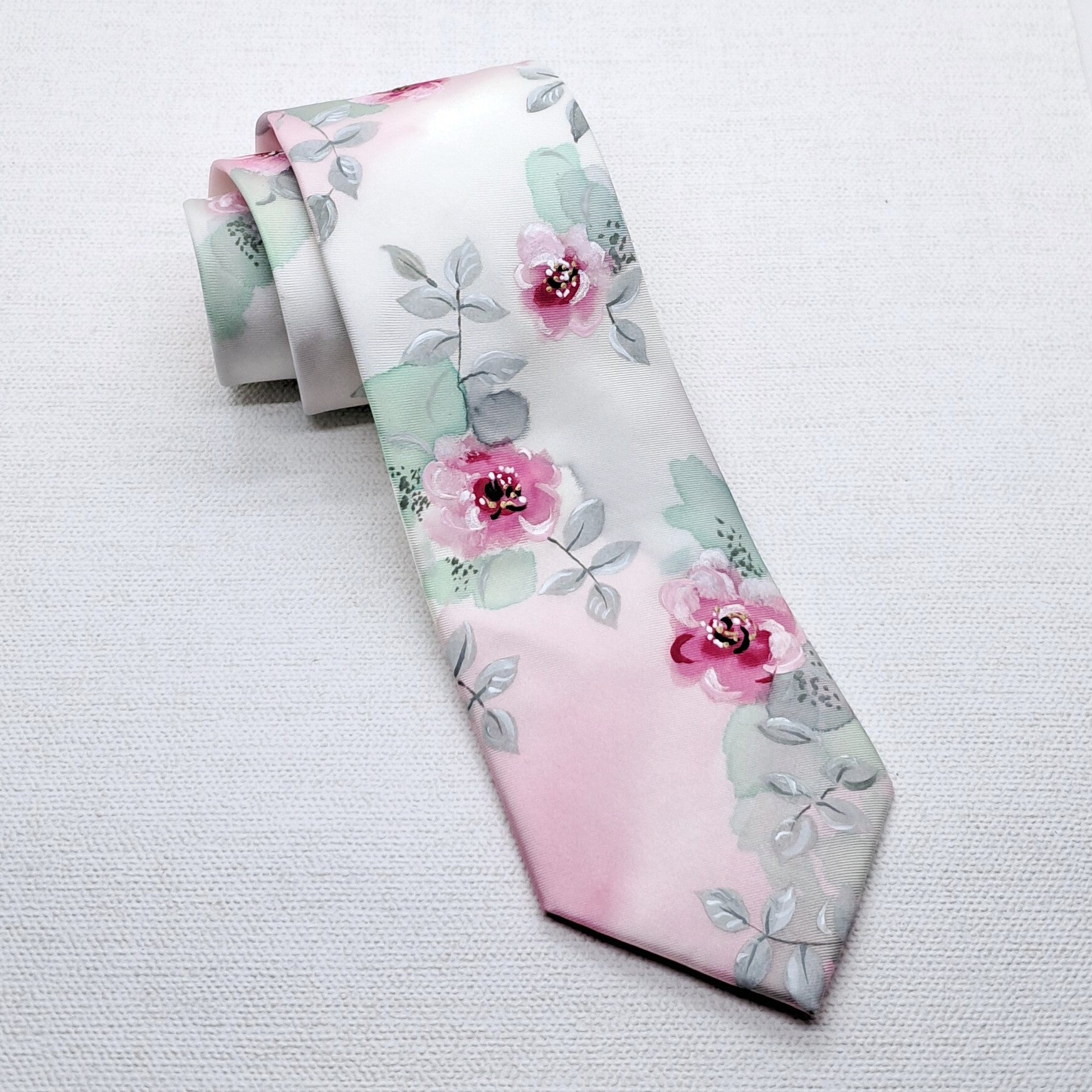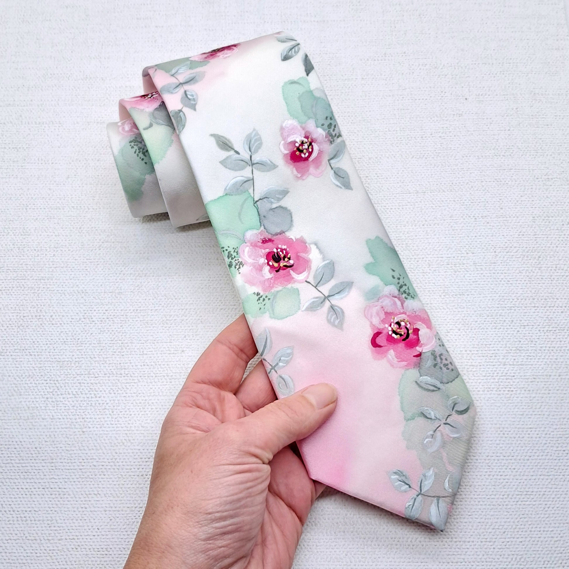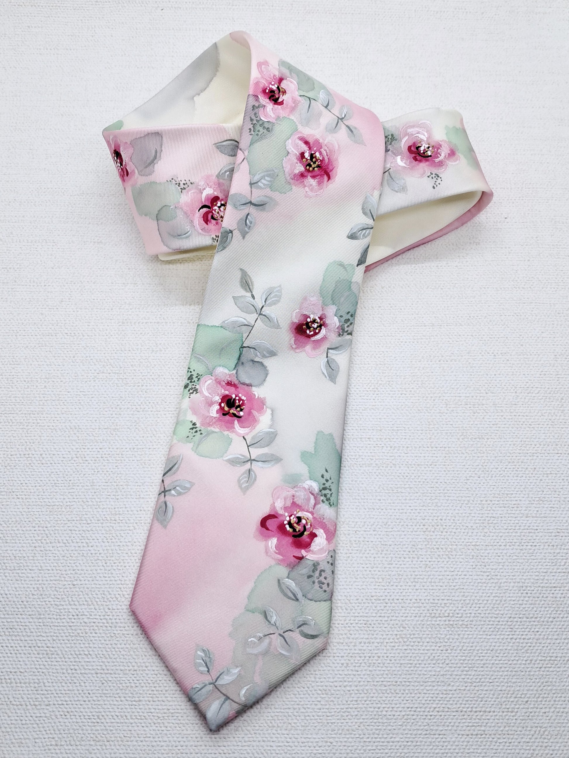 On a base of creamy white pure silk this tie is hand painted with pale pink flowers with pastel green and grey silk dyes. A floral design perfect for weddings, spring and summer.