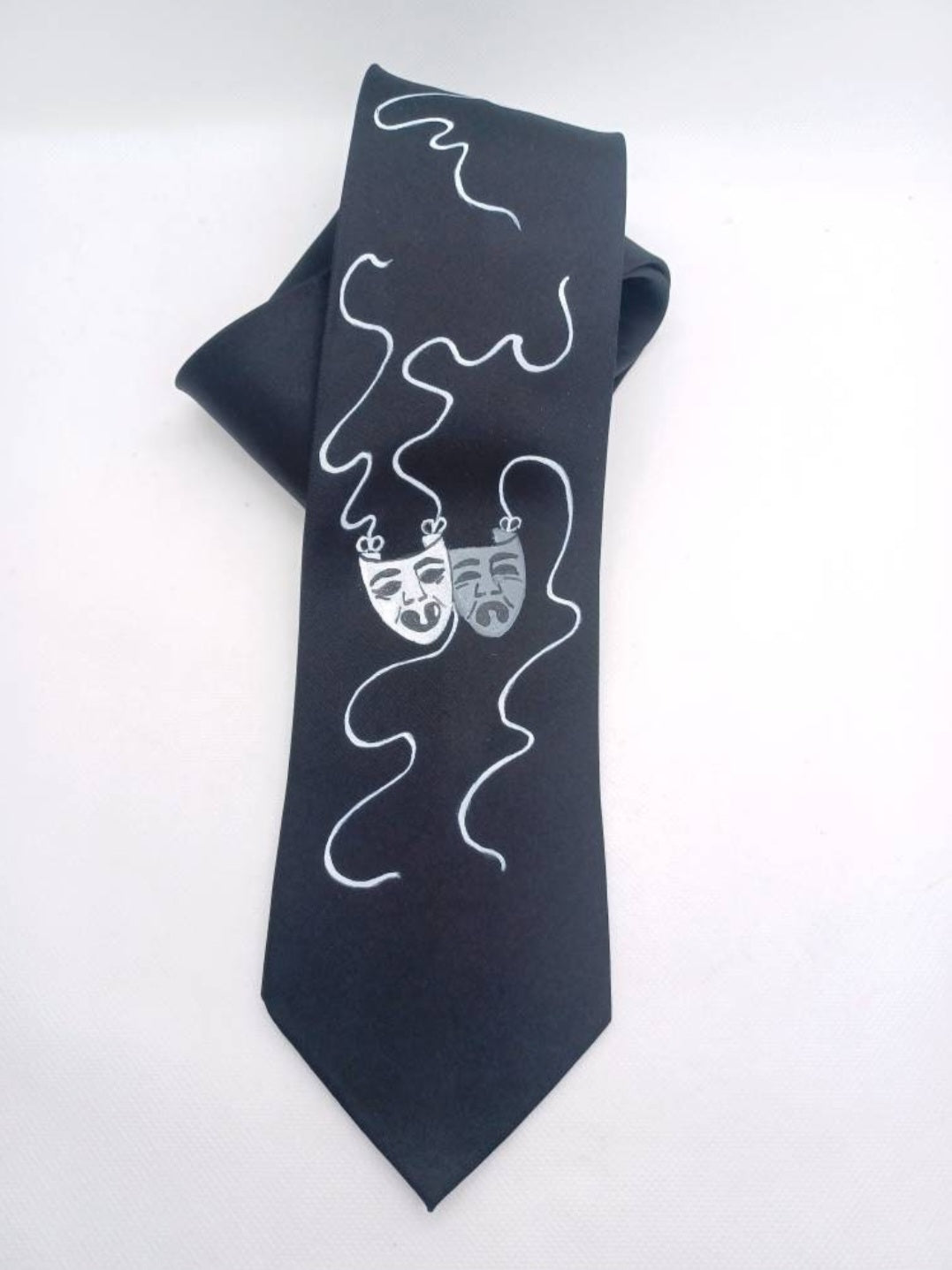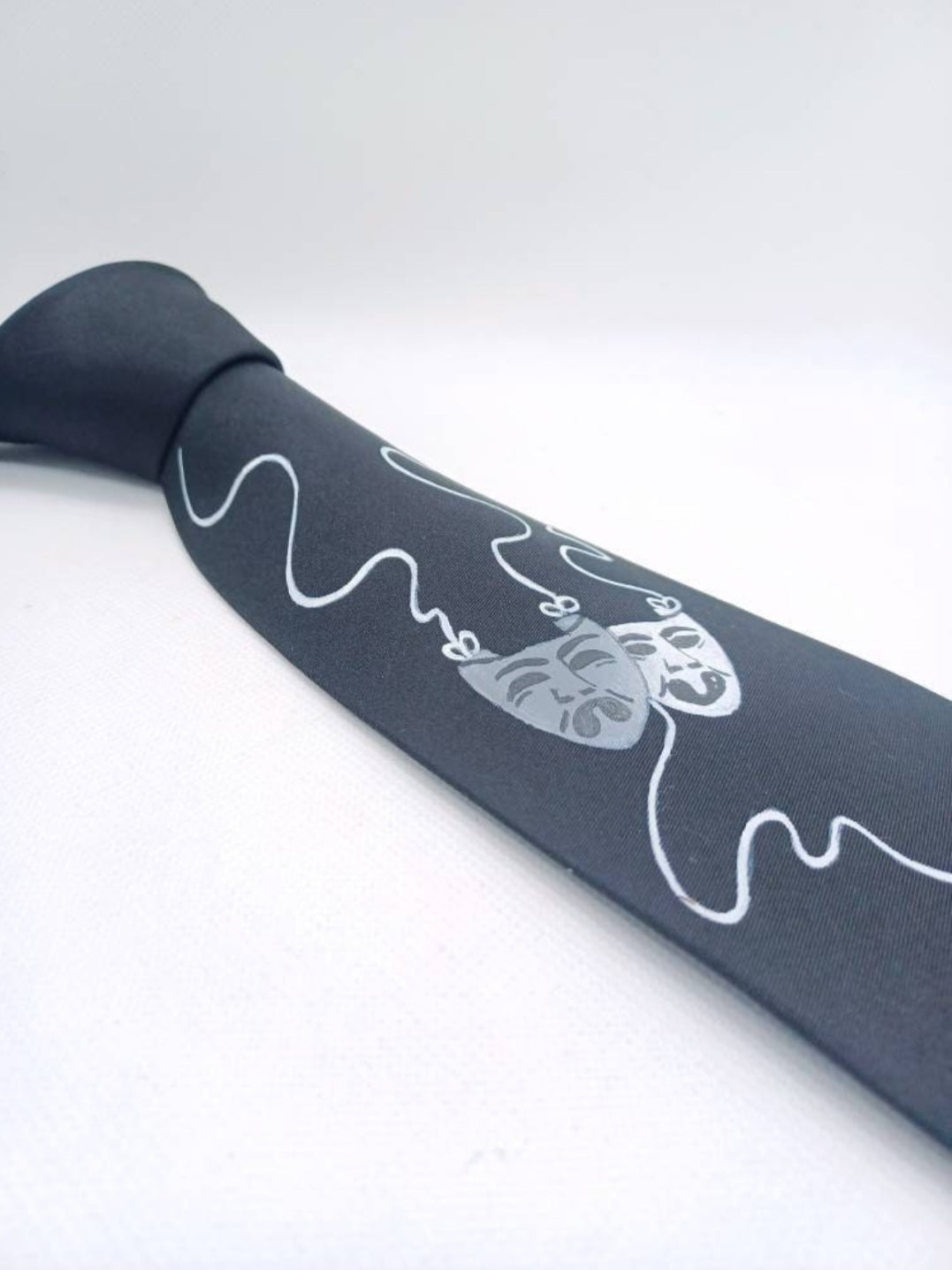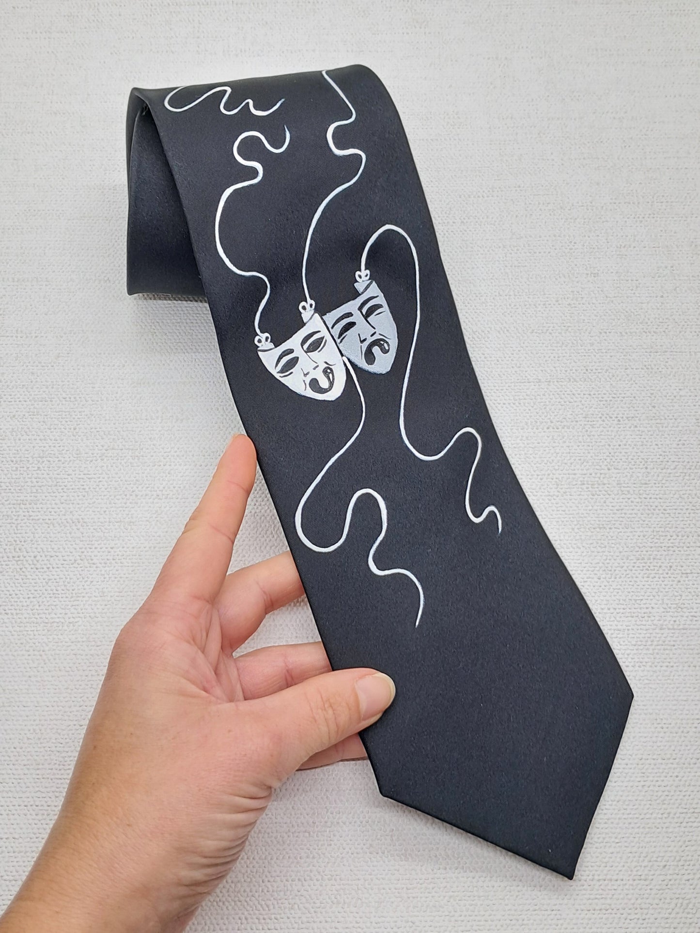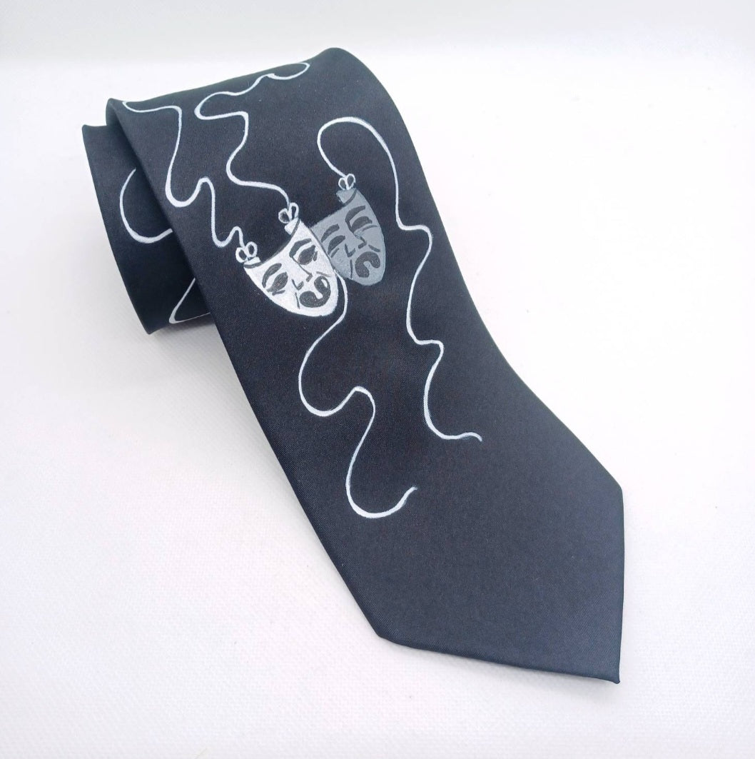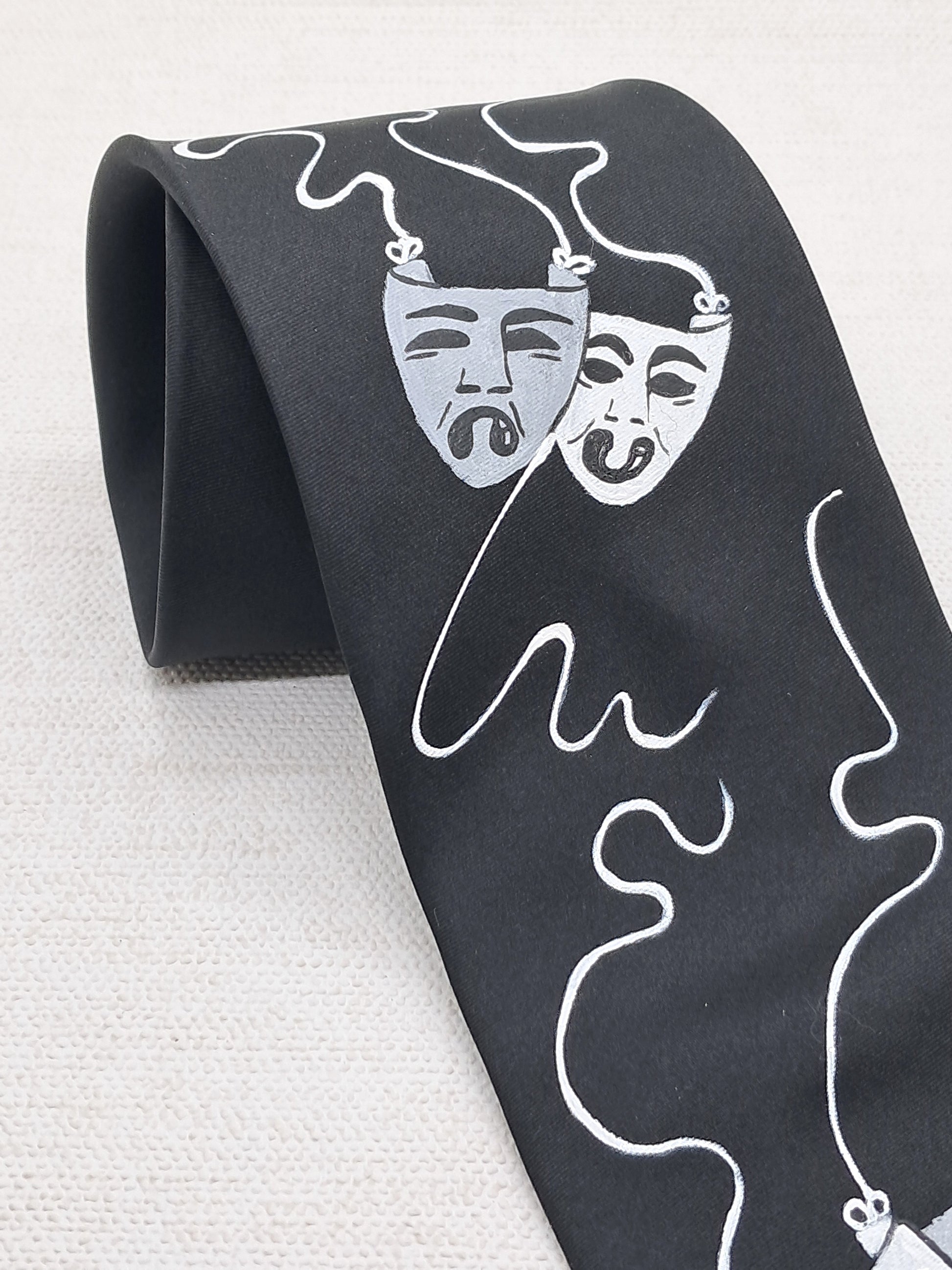 On a base of black silk this tie is hand painted with comedy and tragedy theatre masks. Perfect for actors and performers.